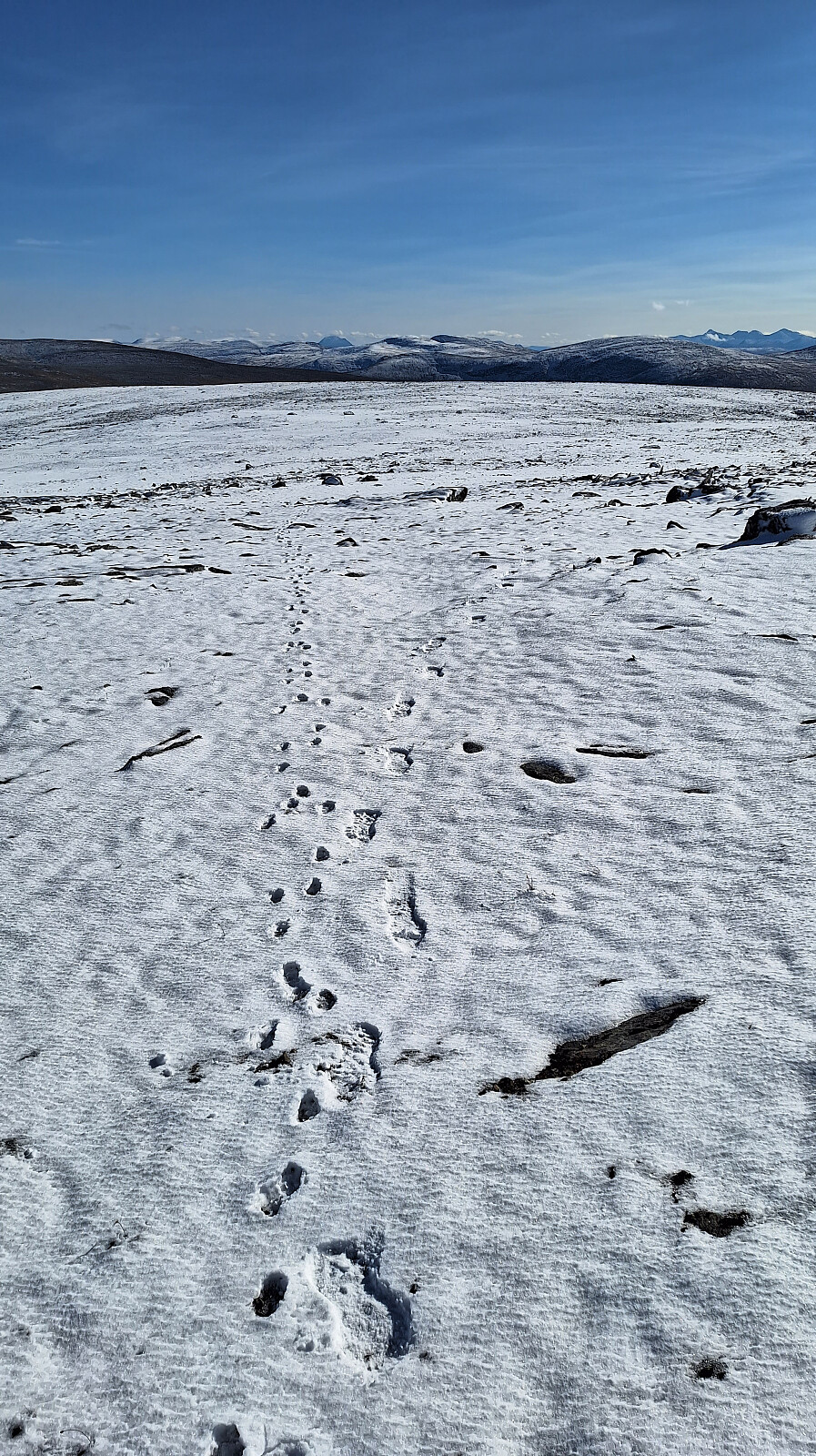 Tåka hang tung over Oppdal i dag tidlig, men straks jeg kom til Driva ble det knallblå himmel og helhvitt i høyden. Gikk i snø fra parkeringsplassen i enden av Sæterfjellvegen og fulgte fotsporene til noen jegere den første biten, men de hadde gått bare en knapp kilometer og kom i retur. Det var kun noen få cm snø, og utover dagen nærmest fordampet den i sola bortsett fra i skyggesidene og over 15-1600 moh. Ved Storbukktjønna hørte og observerte jeg noen sauer på sørsiden av vannet. Tilfeldigvis kjørte jeg forbi to mannlige sauesankere på vei ned etter turen og fikk varslet dem om dyra. De hadde ikke vært så langt inn i dag, men hadde meg seg en liten flokk nedover veien og takket for observasjonen.