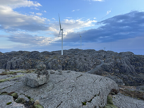 Endelig kom muligheten til å få litt barmark under beina igjen. Jeg kjørte til Helleren i Jøssingfjord og parkerte på p-plassen der. Da det blir tidlig mørkt på denne tiden ville jeg besøke et par topper først før jeg gikk ned til de verneverdige husene. Jeg gikk oppover langs veien til en skarp venstresving, og fulgte merket sti videre inn i skaret retning Hellersheia. Turen gikk via en bratt steinur frem til et stikryss hvor jeg tok til venstre. Herfra var det bare å følge stien videre til topps. Det blåste en kraftig vind på i høyden denne dagen, ellers var det et helt optimalt turvær! Etter Hellersheia gikk jeg tilbake til stikrysset og fulgte denne et lite stykke til før jeg satte kursen retning Kalveknuden. I dette området har vindkraftutbyggingen virkelig satt sine spor! Jeg gikk via Tverrhei frem til Kalveknuden. Begge disse toppene var bare et steinkast unna hver sin mast. Utsikten ellers var upåklagelig. På turen tilbake gikk jeg en mer vestlig bue slik at jeg også kunne svinge oppom NV for Vestvatnet. Dette ble dagens største utfordring hvor jeg måtte småklyve litt for å komme opp til toppen. Samme vei ned igjen og deretter tilbake til stien hvor jeg gikk opp. Jeg rakk akkurat ned til bilen innen mørket la seg over området. Jeg fant frem hodelykta og ruslet så ned til Helleren før jeg kjørte tilbake til hotellet.