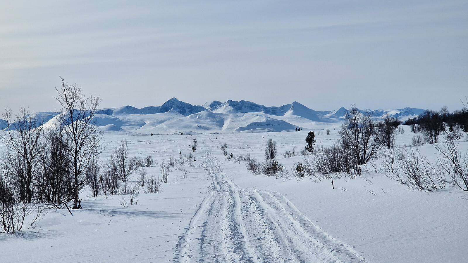 Dagen startet med knallvær og jeg hadde planlagt 2 forskjellige turer pga usikkert ang brøyting av vei. Men valgte denne turen så var jeg på den sikre siden. Dumt å kaste bort så fin en dag med bilkjøring. Parkerte på skiparkeringa ved Beitrusten. Fulgte veien oppover på et noen dager gammelt scooterspor helt opp til Måsårya. Skrådde fra her mot Håneskletten. Skikkelig avblåst snøen på denne siden så her ble det tidlig parkering av skia og fottur resten oppover. Som vanlig super utsikt mot gullrekka med fjelltopper. Samme vei ned til skia. Fra her ble det ganske rett kryssing av dalbunnen retning Grønhøe.Helt supert skareføre.Grei oppstigning langs ene ryggen. Mose og avblåst her også mot toppunktet. Her var det nesten vindstille og sola varmet så da ble det lunsj her. Samme vei tilbake et stykke før jeg svingte ned mot Grønøbua.Krysset det nykjørte skisporet rett bak bua før jeg kom meg ut på den herlige skaren over flatene vidre ned langs veien tilbake til bilen. Får virkelig ladet batteriene på sånne dager i den fineste lekegrinda.