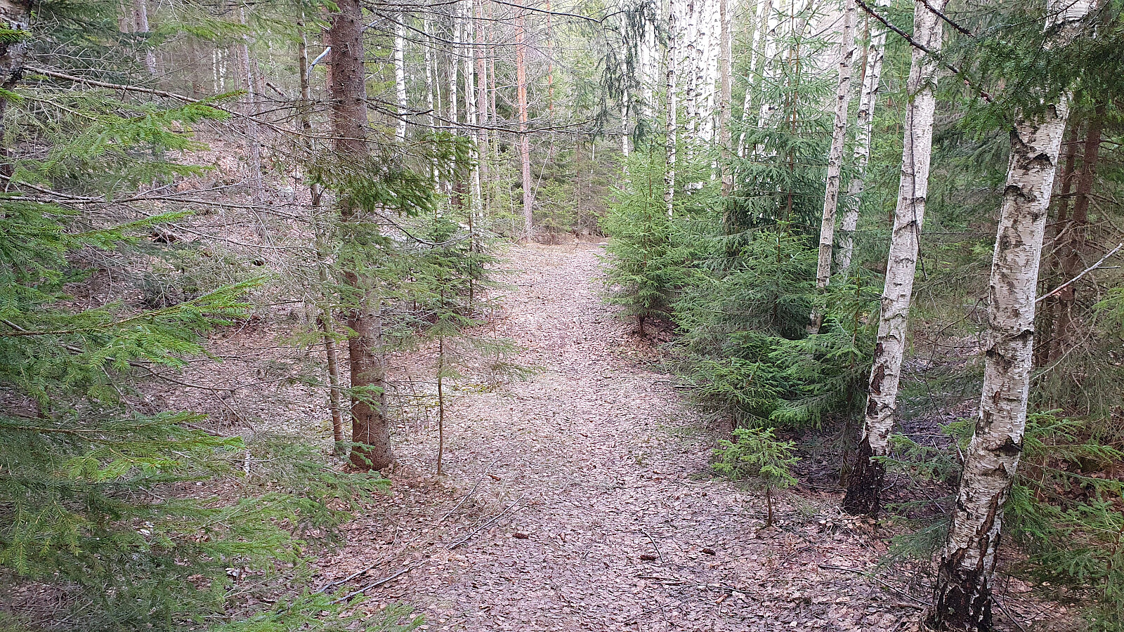 Fra Øygardsfjellet (349) fulgte jeg samme sti ned til det første stidelet igjen, der det hang et rødt bånd. Her valgte jeg nå den mindre brukte stien som gikk mot nordvest, og over en liten høyde. Stien ble etter hvert borte, og jeg havnet nedi øverste del av Øygardsdalen. Fram til nå hadde det vært lite snø å se, men i bunnen av dette dalsøkket lå det nokså mye snø innimellom trærne. Opp mot 40 cm på de største flekkene. Granskogen vokste stedvis tett her også, og det gikk tregt de få meterne sørover til stien som ifølge kartet skulle gå oppover mot Skjellafjellet (342).
