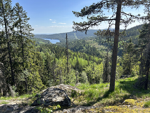 Sykkelturen fortsatte nordover til jeg var på høyde med Rådalshøgda. Her tok jeg først med meg en post som lå litt lenger nord, før kursen ble satt opp mot toppen. Jeg fant ingen sti eller tråkk opp mot Rådalshøgda, men skogen var oversiktlig og grei å ta seg frem i. Ingen utsikt fra verken østtoppen eller vesttoppen, og heller ingen varde eller annen markering.