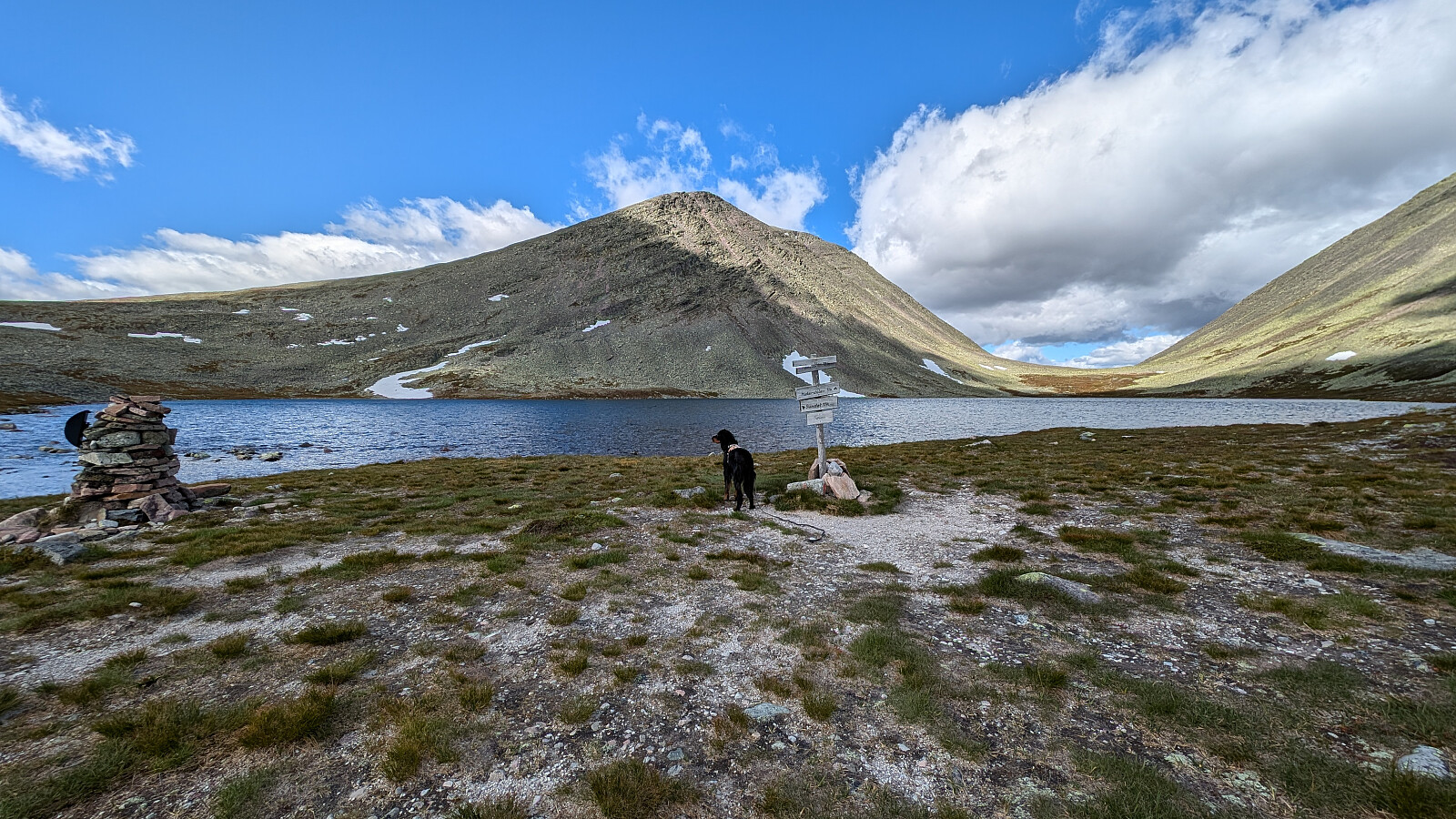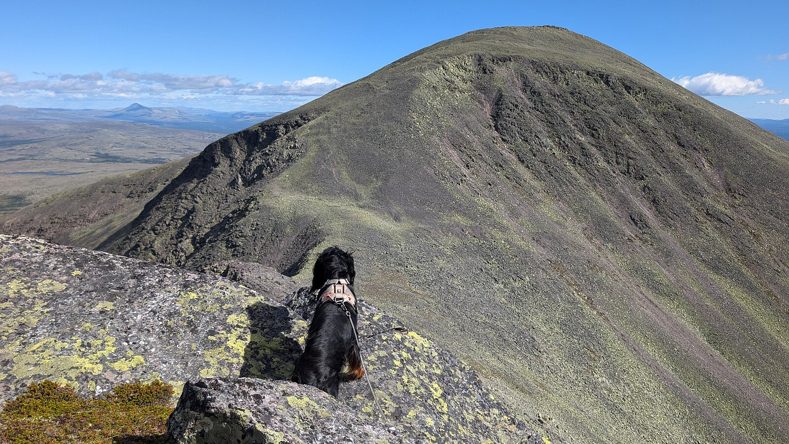 Mer klyving enn jetg husket fra forrige tur her i 2013. Noen plasser måtte jeg hjelpe Embla med en dytt bak. Hun klager ikke og kommer seg stort sett overalt. På toppen av Midtre var det tilnærmet vindstille og varmt. En herlig pause på toppen før vi startet nedstigningen i nok ei lang ur. Var bortom de to toppene før vi kom oss forsiktig ned til vannet. Ny pause med drikke og Embla fikk seg et bad og fylte opp vannlageret.