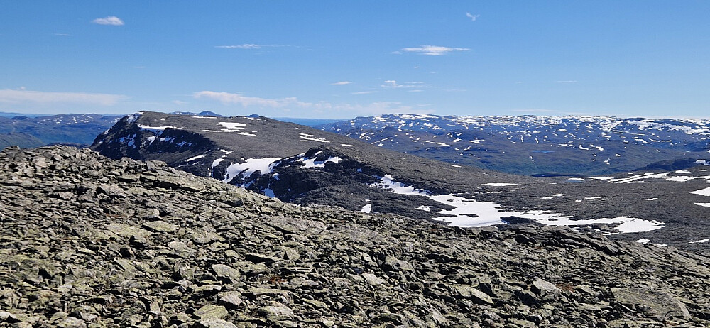 Denne runden minus fyrste låg i god prioritet oppi hovudet. Sidan eg observerte Boven på tur i Ål -fjella, sende eg ein SMS førespurnad laurdag. Tilfeldigvis hadde han planlagt denne runden måndag. Berre at han hadde plussa på med ei ekstra raud nål. Litt raskare retrett frå Porsgrunn søndag, der vi var på feriebesøk. No med kurs Vavatn. Marita var sporty og tok bussen vidare frå Tuv og heim til Lærdal. Avreise litt før 9:30 dagen etter frå Vebuleino. Der byrjar stien mot Ranastonge. Klårver og varmt. På sti i lett terreng oppover, før vi litt etter elvekryssinga, gikk inn dalen i retning Steinbunøse (også omtala Hydalsberget). Toppa etter 1,35 og 5,7 km. Så retning Ranastonge, og status 10 km ved ankomst varden. Nydeleg utsikt til «alt». Såg til Gaustatoppen og til Rondane. Vidare i snill steinørken til Storebottegge, 15,7 km. Brutto tid 4:55, vel halvvegs i km, og ved godt mot. Og for ei utsikt. Vidare og nedatt frå denne toppen, noko grøvre ur, og kuppert nede ved skars-området. Her kunne vi ha følgt eit drag i ei enno knappare rute, eller teke større kurve rundt i lenger, kanskje optimal rute. Men problemfritt. Sørøst for Storebottskaret toppa etter 18,4 km og 6:20. Her var mura eit le ved varden. Vidare ned mot vatn, og opp til grøn topp. Det viste seg å vere lurt, då vi fekk nokre lange snøfelt i retning skaret før siste toppen. Endeleg Såta vel 23 km, og 7:30. No stod det att å finne god rute ned bratta herifrå. Ove losa oss fint ned bratta, og det vart aldri vanskeleg. Aleine hadde eg etter fyrste avsats, kanskje teke ruta om Såta sør, for mindre bratt rute. Men dette blei optimalt, og lettare enn det ser ut på avstand. Må halde seg til tørre hyller midt på ryggen. Nede frå toppen, i lett terreng mot elva. Den var rimeleg stor, men vi fann ei løysing over. Så var det å navigere til stien for siste etappe mot mål og start på ruta. Ca 28 km og vel 9 timar brutto. Denne turen i varmt klår-ver var ei god oppleving. For ei utsikt. Vi såg Gaustatoppen, Rondane, og heile breidda av Jotunheimen, ved berre å snu litt på hovudet. Så er det nærutsikta med kontrast mellom steinørken, botnar og styrtningar, samt frodige grøne fjellområde, som ned mot Smådalen i Vang. Og mykje meir. Tilrår denne ruta, som er lang, men fin. Takk til Ove for at eg fekk henge med i dag :)