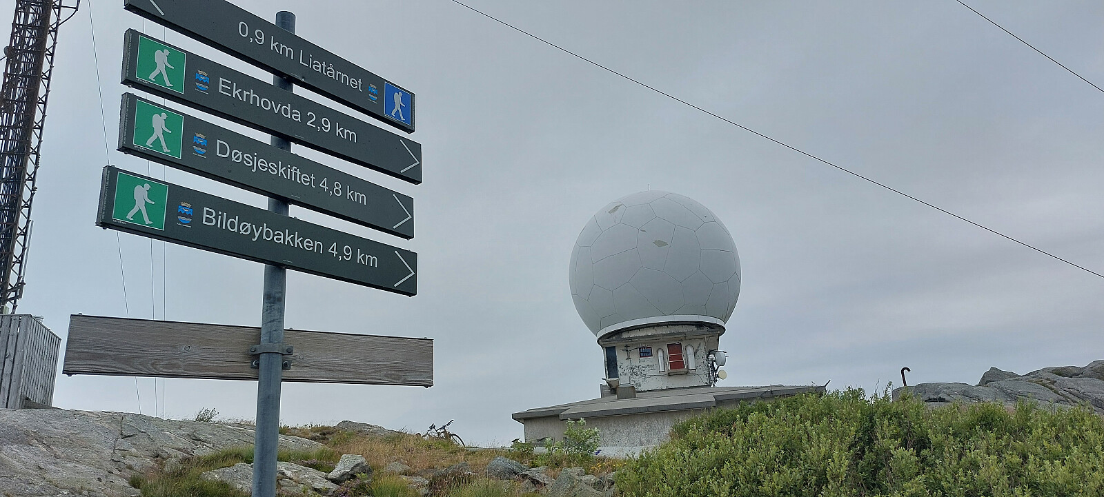 Kjørte Erkhovdvegen til Pyttane/Nordre Stølen p-lomme. Stor gratis parkeringsplass. Det er asfaltert vei stengt med bom helt opp til Pyttane. Fra Pyttane søndre er det merket sti til Liatårnet. De store hvite kuplene er radarer utplassert av AVINOR. Radarene kommuniserer med flyene i nærheten og samler informasjon om høyde, avstand og identitet på flyene. På bakken på Flesland sitter flygelederne og får all informasjonen på skjerneme sine. Med denne informasjonen kan de trygt kontrollere trafikken til og fra Flesland.