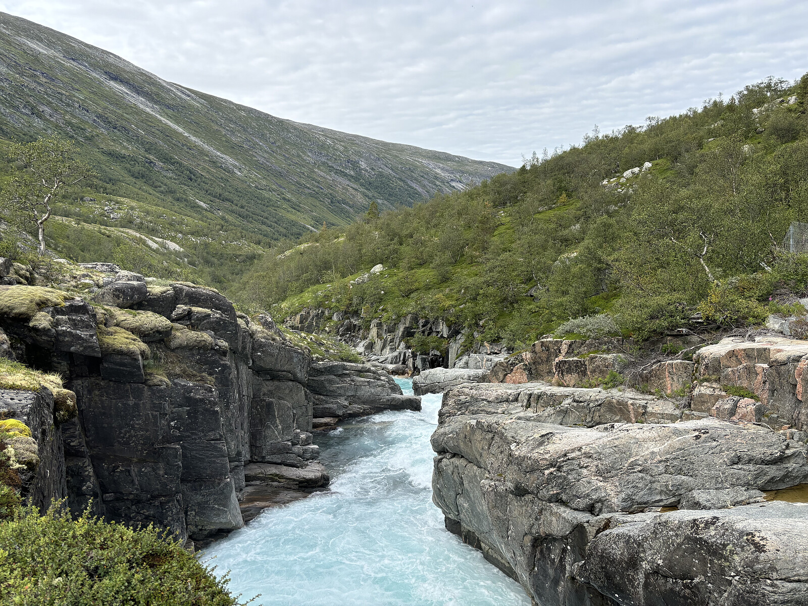 Dagen etter vakna vi til skyfritt og blikkstille vær, og tosifra temperatur frå morgonen av. Vi hadde kanskje tenkt at elva kunne vadast, men det kunne den absolutt ikkje, så vi gjekk opp til osen og over hengebrua der og så nedatt på andre sida. Vi prøvde å vinne høgde for å få starta litt på toppturen, men det var meir kav enn gevinst. Ned igjen følgde vi ryggen heilt ned og dnt-stigen opp igjen.