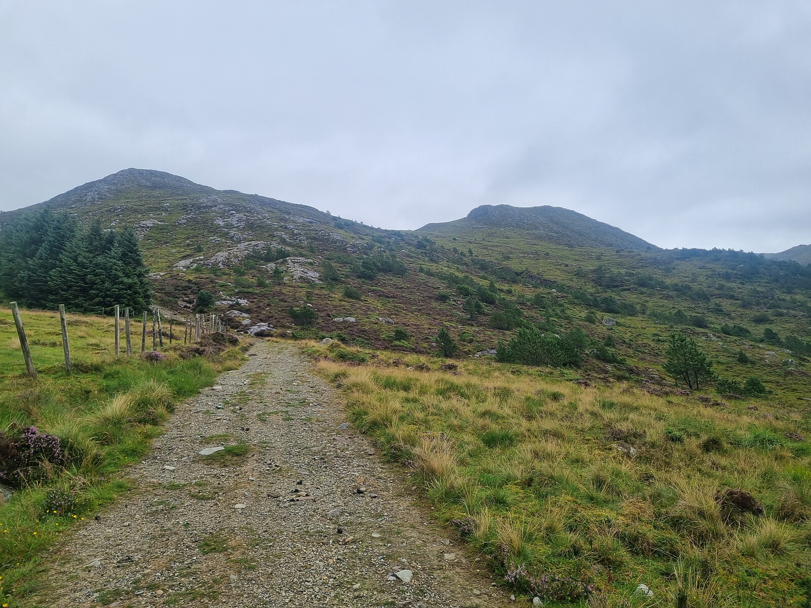 På veg ut var det mykje regn og litt yr innimellom. Eg parkerte nede ved vegen ved Eikeset. I det eg hadde parkert bilen og gjorde meg klar for å gå, slutta regnet og eg håpa i det lengste at tåka skulle lette også. Eg gjekk opp vegen ved Eikeset og vidare over på traktorveg, som etterkvart minna meir om ein litt brei sti enn ein traktorveg. Greitt å gå på når det tydeleg har regna denne natta.