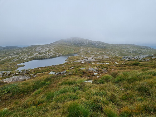 Etter kvart gjekk vegen over i merkt sti og dermed litt blautare å gå. Stiane i Bremanger er veldig godt merka, så når det var litt tåke på Langevasshornet, så gjorde ikkje det så mykje med tanke på at det er mogleg å sjå kvar eg skulle gå uansett. Eg hadde nok føretrekt å gå utan tåka på toppane, men av og til så skjer det og då reiser eg ikkje heimatt utan å gå turen eg har planlagt.