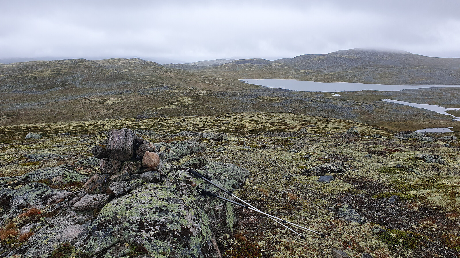 Ved 8-tiden ønsket jeg Erling lykke til med resten av vaktperioden på Lågaros, og ruslet avgårde mot Mogen. Tross gråvær og lett regn, forlot jeg stien ganske tidlig og gikk over 3 topper som ligger like øst for stitraséen. Fint å gå i terrenget her, så jeg brukte ikke veldig mye ekstra tid på disse bestigningene.