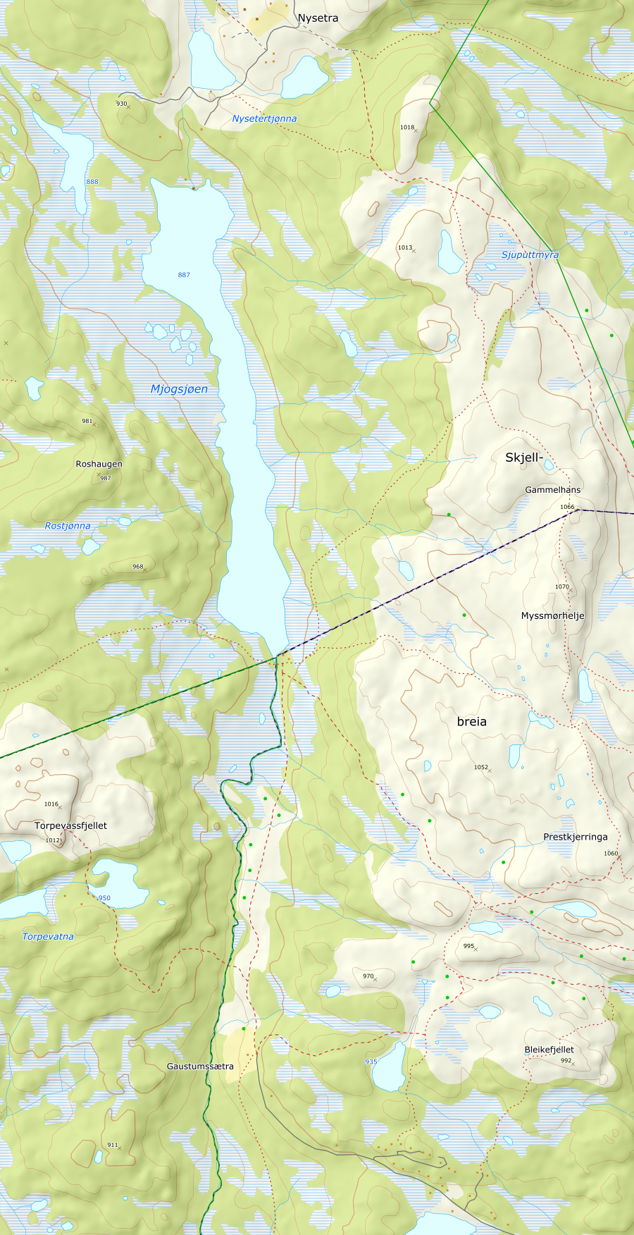 Tur fra Nysetra i dag. Tur i stuttbukse og T-trøye, men litt kald vind på Skjelbreidsfjellet. Veldig vått i terrenget, og rådene var stort sett bekkefar. Da jeg gikk Blesterråket fra Blesterråkvarden til Skjelbreidsfjellet, tenkte jeg mye på min oldemor, Ida Nygaard, som nok gikk her adskillige ganger med buskapen fra Øygarden til Blestern. Fiska var veldig stor i dag, og det var umulig å komme tørrskodd over ved Mjogsjøosen. Steinsettinga lå lå dypt under vannflaten.Møtte noen mellom Nysetra og Prestkjerringa, senere så jeg ingen.