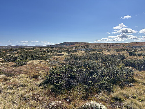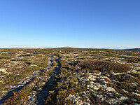 Like før jeg kom helt ned til bekkedalen på vei mot høyde 1095 igjen fikk jeg øye på en elg som drev og beitet like foran meg. Vindretningen var riktig og jeg kunne studere den i mange minutter før den til slutt ruslet vekk. Artig opplevelse! Jeg kom meg inn på stien igjen som jeg hadde fulgt mot Lyngkampen og fulgte denne videre frem til høyspenningslinja nord for Akselvola. Ruta ble lagt via denne toppen både som en fin avslutning på turen og ikke minst for å slippe unna de oversvømte partiene over stien nedenfor.