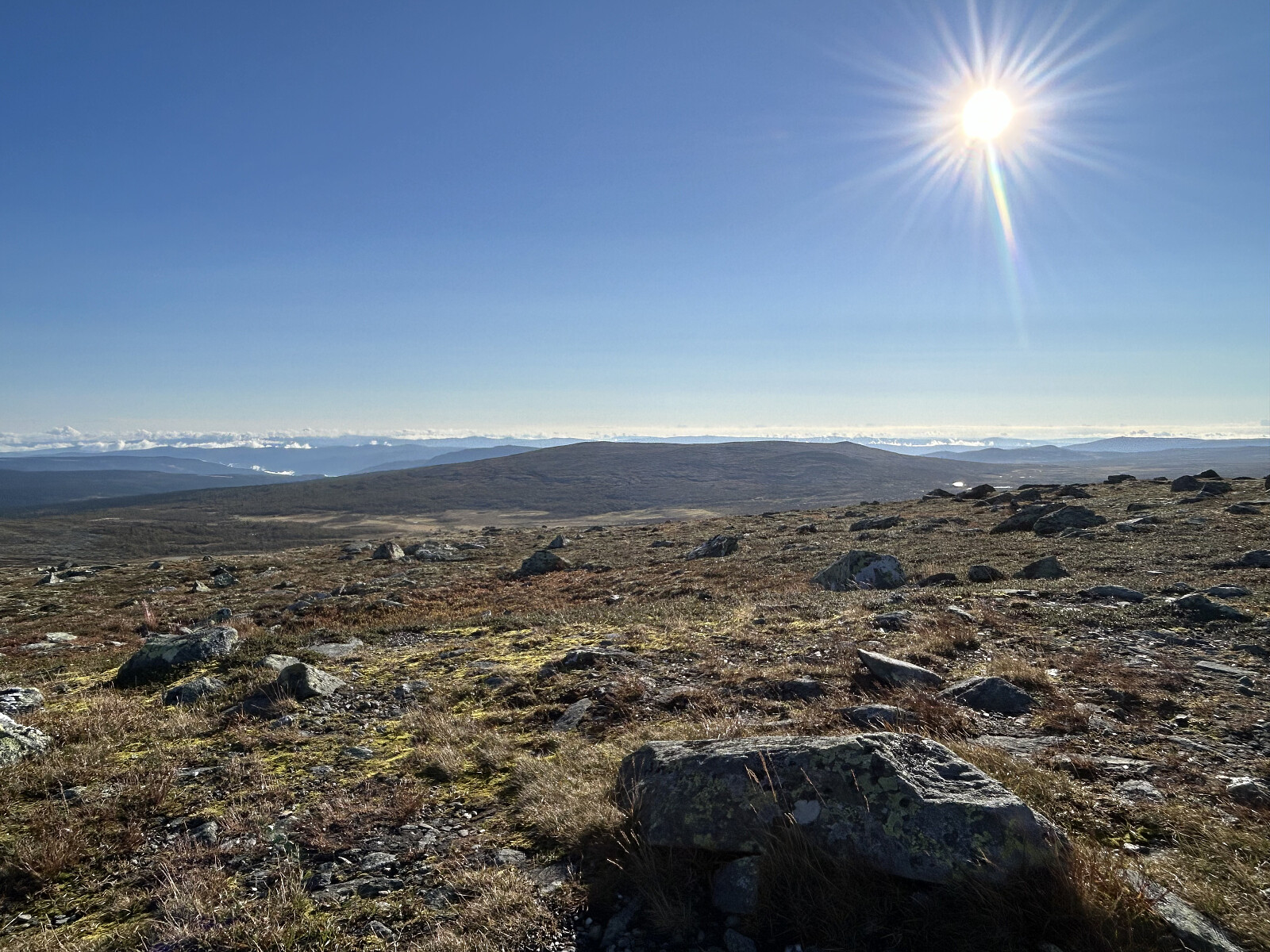 Det er perfekt å overnatte ved turens startpunkt! Da jeg våknet opp til en flott soloppgang var det bare å gjøre unna et raskt morgenstell, litt frokost og så labbe av sted. Det er ikke så ofte jeg er på tur før kl 7:00:) Nattens regnvær hadde laget flere lokale innsjøer på de laveste partiene, ellers var det fint å følge den gode stien inn til Lyngkampen. Litt langdrygt men også veldig lettgått terreng. Ikke overraskende var utsikten fremragende i alle retninger, og jeg unnet meg en lang pause på toppen. Blant annet kunne jeg studere ruta videre mot Nordre Gråvola. I hele dalbunnen mellom toppene var det flere vann og mange ekstra våte myrer denne dagen og jeg var litt spent på om jeg kom meg tørrskodd fra dette.
