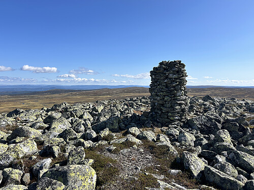 Jeg gikk ned de fleste høydemetrene omtrent der hvor jeg kom opp og skrådde deretter ned mot stien som fører ned mot Eldådalen. Her var det som ventet flere oversvømmelser på stien, men på et merkelig vis klarte jeg å komme meg forbi uten å bli våt på føttene. Dermed var det bare å karre seg oppover lia via vesttoppen til Nordre Gråvola. Akkurat som for Lyngkampen er toppen temmelig flat og man er nesten avhengig av varden(e) for å finne det høyeste punktet. På denne toppen er det for øvrig en liten varde hundre meter nord for hovedvarden som viser toppunktet.