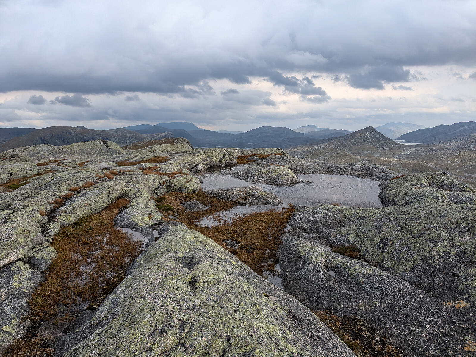 Det var meldt vindkast på 18 meter i sekundet, og det stemte bra. Det var nesten umulig å gå oppreist, og det jeg trodde var regn var vann som ble pisket opp fra de små pyttene på toppen. Her er det en bitteliten varde litt bortenfor høyeste punkt. På returen måtte jeg passere den krevende elva igjen, og på tur ned ble det ny vading over elva som kommer fra fra den tidligere besøkte Maatstjonneh. Elva hadde fått stor vannføring på tur