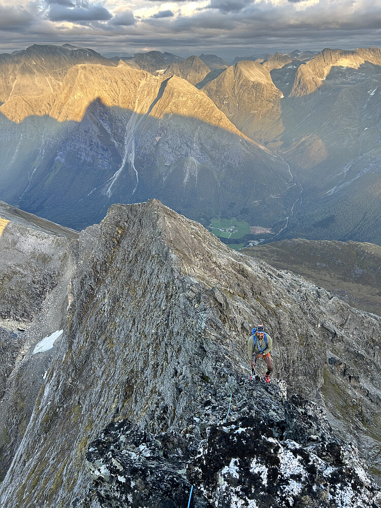 Etter traskepartiet kommer den virkelig luftige og litt mer krevende delen av østegga. Den begynner med en nokså enkel men eksponert nedklyving til et skar, før det er en del opp og ned over diverse interessante små hammere og smale parti på det første relativt flate partiet av eggen. Et par av hammerne byr på utfordringer som må kunne defineres som klatring, og som nok kan føles vanskeligere enn den er ettersom klatringen tidvis er rimelig luftig og et fall vil sende deg av eggen dinglende over avgrunnen. Selv om det aldri blir direkte vanskelig (kanskje noen korte sekvenser rundt grad 4/4+?), er mange av de store formasjonene man fort ender opp med å måtte ta i eller stå på ikke akkurat bombefaste. I tillegg er det generelt mye løst og noe råttent fjell. For min del ville det derfor ikke vært aktuelt å gå denne delen av eggen uten tausikring.