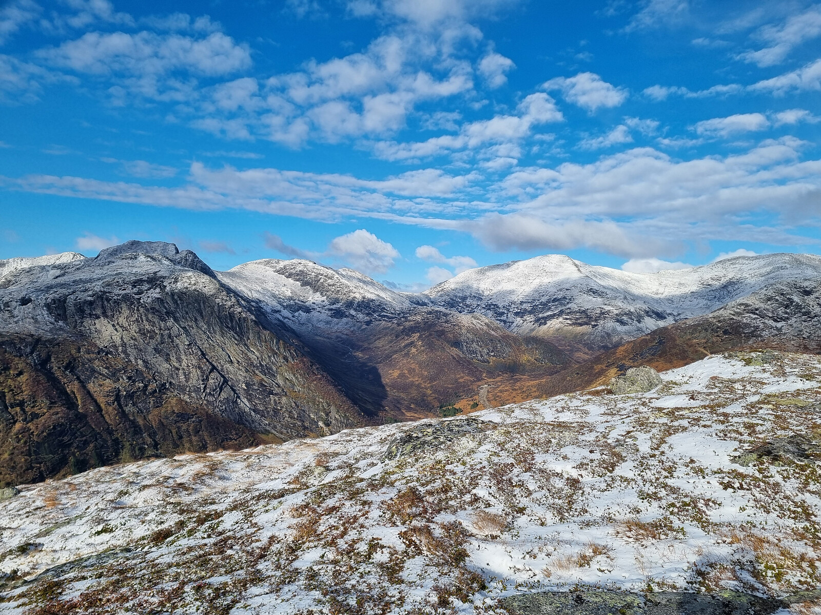 Til mi store overrasking var det komen nysnø på toppane, men ikkje så mykje at vi vassa i snø og det gjekk heilt fint å følgje stien.