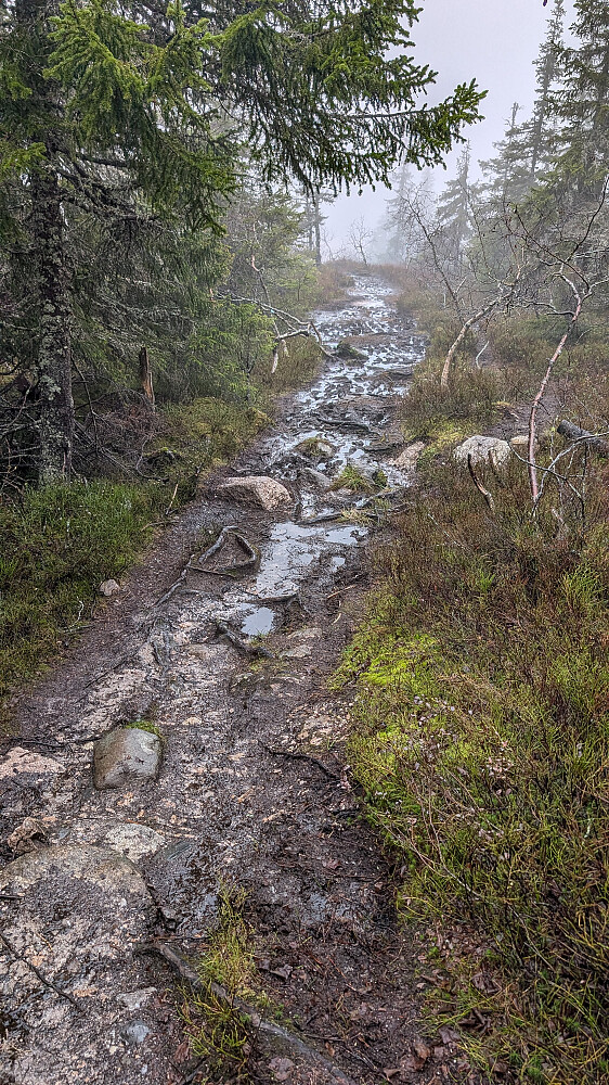 Videre gikk jeg raskt videre i tåke, myrer og forferdelige slitte stier. Totenåsen under slike våte forhold er ingen høydare. Trening ble det iallefall ut av dette. Ca 4 timer på tur under slike forhold er bra trening. Selv under slike våte forferdelige forhold var jeg tørr og varm på beina etter turen. Blir mye "presisjonsgåing" på kanten av stiene. Stiene blir bare bredere og bredere. Tur alene med Embla.