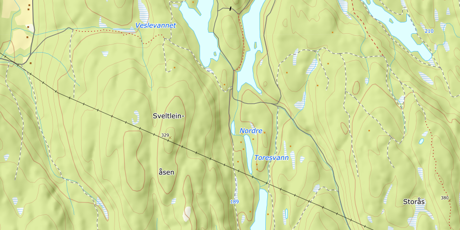 Jeg kjørte inn til Lysdalen og parkerte i en liten lomme langs veien. Herfra fulgte jeg veien frem til hytta som ligger rett nord for toppen. Like før hytta fortsetter en svak sti som jeg fulgte videre opp til et hogstfelt. Sveltleinåsen ligger på toppen av hogstfeltet, like ved en av høyspentmastene. Herfra fikk jeg fin utsikt blant annet over til turens neste mål, Storås.