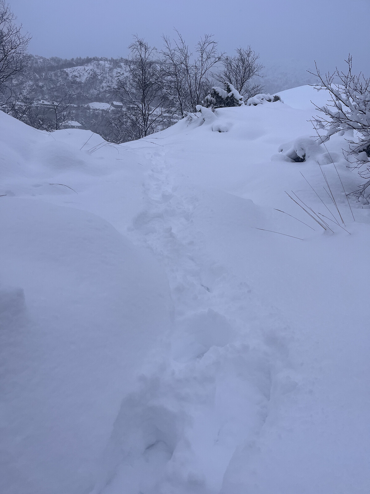 Turen begynte fint med Løvstakken på langs fra Bønestoppen, her var det fine spor til å løper i, faktisk mye bedre enn på fortauene rundt Bergen nå om dagen. Turen gikk videre ned til Melkeplassen, for så opp til Olsok og Damsgårdsfjellet, men her kom jeg til «upløyd mark» - tanken om å avslutte med Løvstakken slo meg et par sekunder, men slo det like raskt fra meg, for ta en «Goggins». Så da ble det bare å stålsette seg og traske oppover til knes i snø, bommet litt på stien innimellom, men kom meg opp til slutt. Det hadde nå begynt å snø tett og vinden hadde tatt seg opp, så skippet Gravdalsfjellet som også var planen. Satt derfor kursen rett ned i Nordnesdalen og videre gjennom Fyllingsdalen og opp til bilen som stod parkert på Bønestoppen.