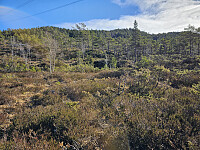 Ny tur i Samnanger, nå til Steinafjellet. Ruten jeg hadde planlagt var ut fra et tur innlegg som dukket opp på Facebook. Parkerte ved innkjøringen til privat vei som går til gårdene Kampen. Veien er avstengt med låst bom. Gikk veien oppover og tok av på en traktorvei litt for jeg kom til første gården. Traktorveien delte seg og jeg valgte å ta den som gikk til venstre da det er tegnet svak sti på kart litt lengre oppe. Fant svak sti som fulgte høyspentledningen oppover, men den forsvant. Tok derfor retning rett mot toppen gjennom skog og brake uten sti. Oppe på flatere parti nord for toppen kom jeg inn på en svak sti som gikk retning toppen. Misten den ved en myr og tok min egen vei resten opp til toppen.