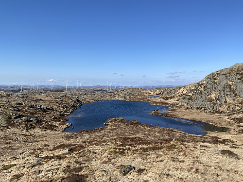 I første vegsving tok jeg ut i terrenget og rundet Ytre Vølstadtjørna på sørsida med håp om å kunne karre meg rett opp til 586-toppen. Dette gav jeg opp fordi det øverste partiet virket altfor bratt. I stedet måtte jeg runde 586-toppen på vestsida med litt tap av høyde og kom etter hvert opp i sadelen ved Syltre. Her valgte jeg å runde til topps på turmålet via den tørre og relativt lettgåtte ura på østsida, og jeg brukte om lag 1 time 10 min via mitt lite optimale rutevalg. Kanonutsikt fra denne dominerende toppen selvsagt, og kjente igjen andre kjemper som Vådlandsknuten og Bynuten samt Reinaknuten og andre topper i Jørpelandsheia i nordlig retning.