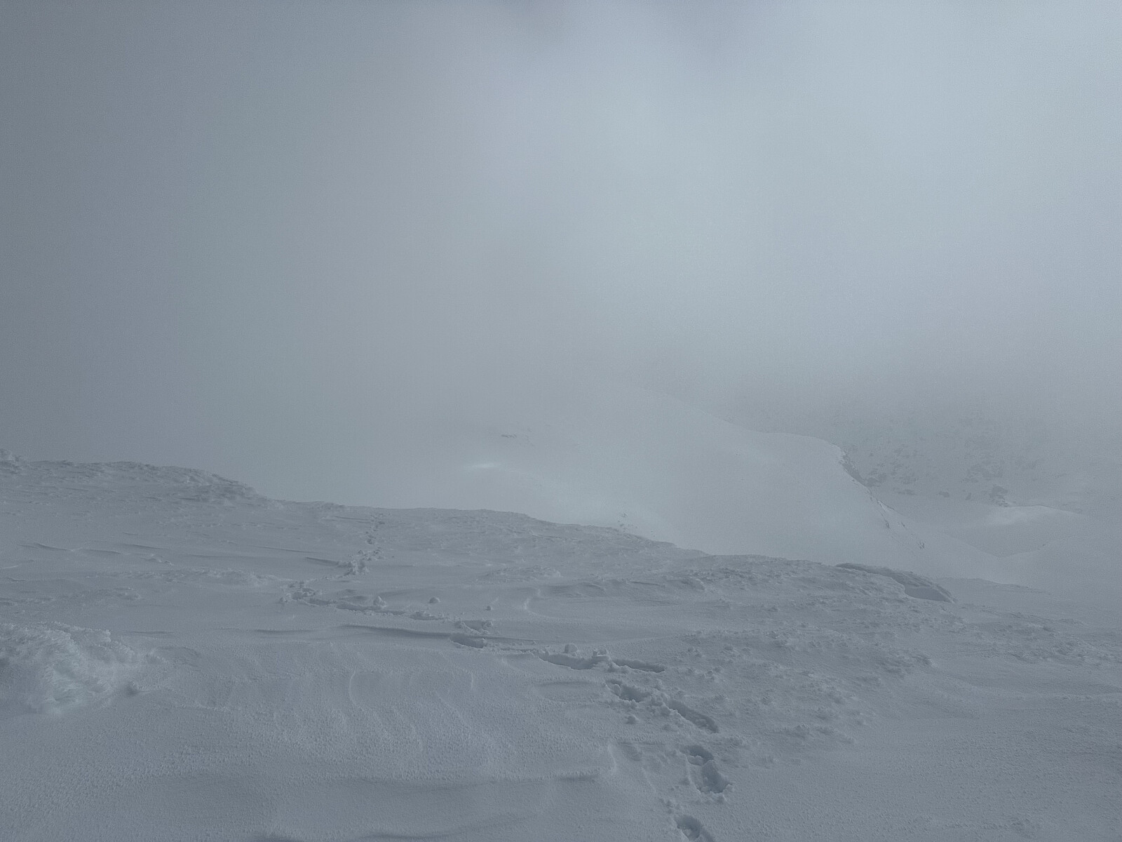 Bratt opp fra sadel, men veldig greit. Hadde virkelig gleda meg til denne etappen opp hit. Stølsnostinden har etter min mening en av de vakreste utsiktene i hele Jotunheimen. Ikke minst er klyvinga hele veien opp noe for seg selv. Jeg har vel også sakt at dette muligens er noe av den morsomte klyvinga i hele Jotunheimen. Eksponert, men følelsen er ikke der, og det er små og store utfordringer. I dag var føret rett og slett helt gull. Godt med snø i renneformasjonene, fast og god skare ellers. Kunne gå oppreist hele veien både opp og ned. Dessverre var tåka tjukk på toppen. Uansett utrolig artig å ha vært her på vinteren. Med skiene på sekken gikk ferden nå videre mot Midtre Stølsnostinden.