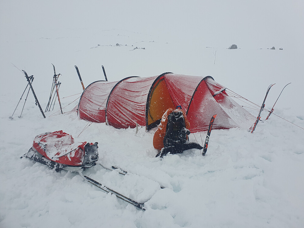 Neste dag var det litt ymse vær. Regna på morgenen, men det ga seg innen vi klarte å surre oss ut av teltet. Når vi kom innpå kvistløypa mellom Finse og Krækkja tok vi lunsj oppi bakken, og da starta det å dryppe igjen, så vi satte opp teltet. Innen vi gikk ut var det snøvær og snart whiteout. Likevel høy moral hos barna, og vi fortsatte til vi hadde gått en mil den dagen også. Derfra ville det bare være nedover neste dag.