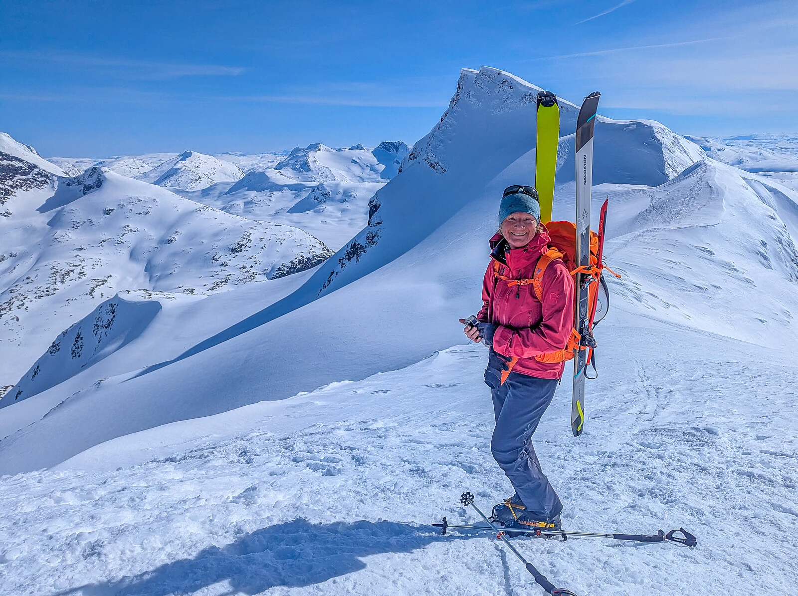 Jeg kjørte opp til Fossheim på fredagen, og startet passe tidlig på turen inn til Krossbu. Det var ganske kaldt og friskt, og med helt uforstyrret blå himmel. Morten og Anne hadde vært på en seriøs langtur dagen før, og annonserte at det var fint om vi tok det pent. Så da spaserte vi innover og opp på breen i rolig tempo og bare nøt dagen. Og for en dag det var, Strålende sol, blå himmel, perfekt føre, superhyggelig selskap, masse smågodt. Dessuten ikke mindre enn 7 2000 meter topper. De lå på rekke og rad, og det var så nydelig med alpin utsikt i alle retninger og masse kritthvit snø.