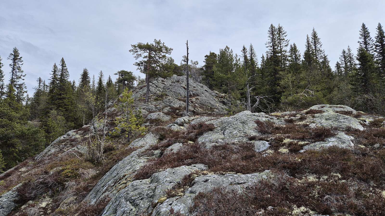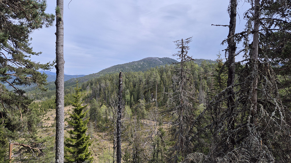 Etter litt vandring i skogen fra traktorveien, nådde jeg den markante ryggen som leder opp mot Kolltveiteggi Nord (808). Jeg bommet på starten av ryggen, og måtte klyve litt til å begynne med. Så kom jeg over på selve ryggen, og den var stilig og veldig artig å følge oppover. Kult med denne stripen med nakent berg i skogen. Jeg måtte stoppe opp flere ganger underveis for å se på utsikten etter hvert som jeg kom høyere.