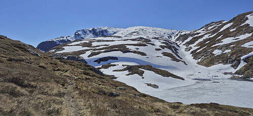 Shortly before getting to Oksatjørni I lost the red markers and given that I did not like the look of the terrain where the trail was supposedly heading, both steep and snow-covered, I made a short detour east to connect with the trail coming down from Ingebjørgfjellet, before both trails combined northeast of Larsbu. The final ascent to the summit was straightforward but quite strenuous given the now almost complete cover of wet snow.