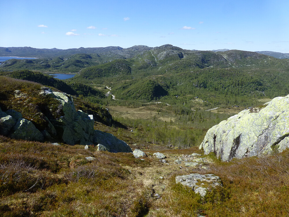 Jeg fulgte stien på kartet, god sti først, så over et myrparti og så oppover ei li på fin sti. Før jeg skulle krysse bekken gikk det en sti oppover som jeg fulgte helt opp i skaret. Bratt til tider, men grei sti. I skaret var det noen småpytter, fint utsikt og toppen ses godt. Da var det bare å traske opp ryggen til toppen.