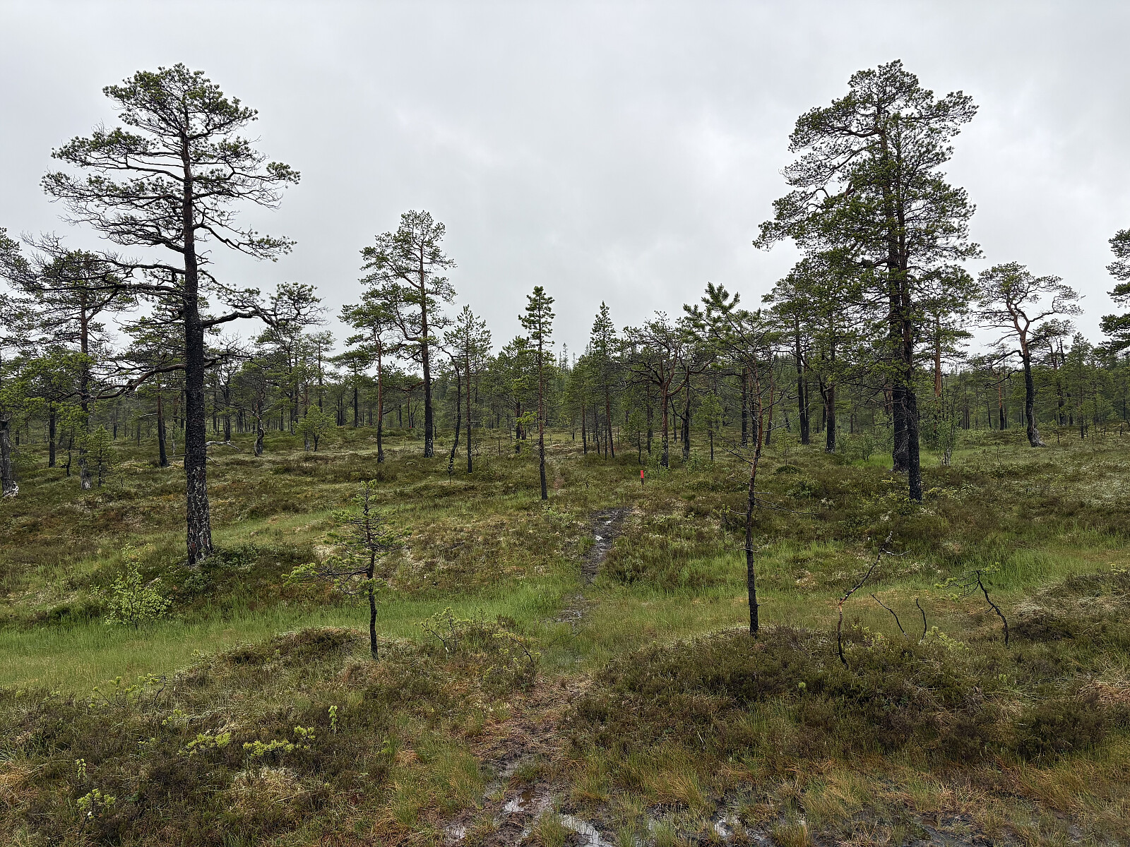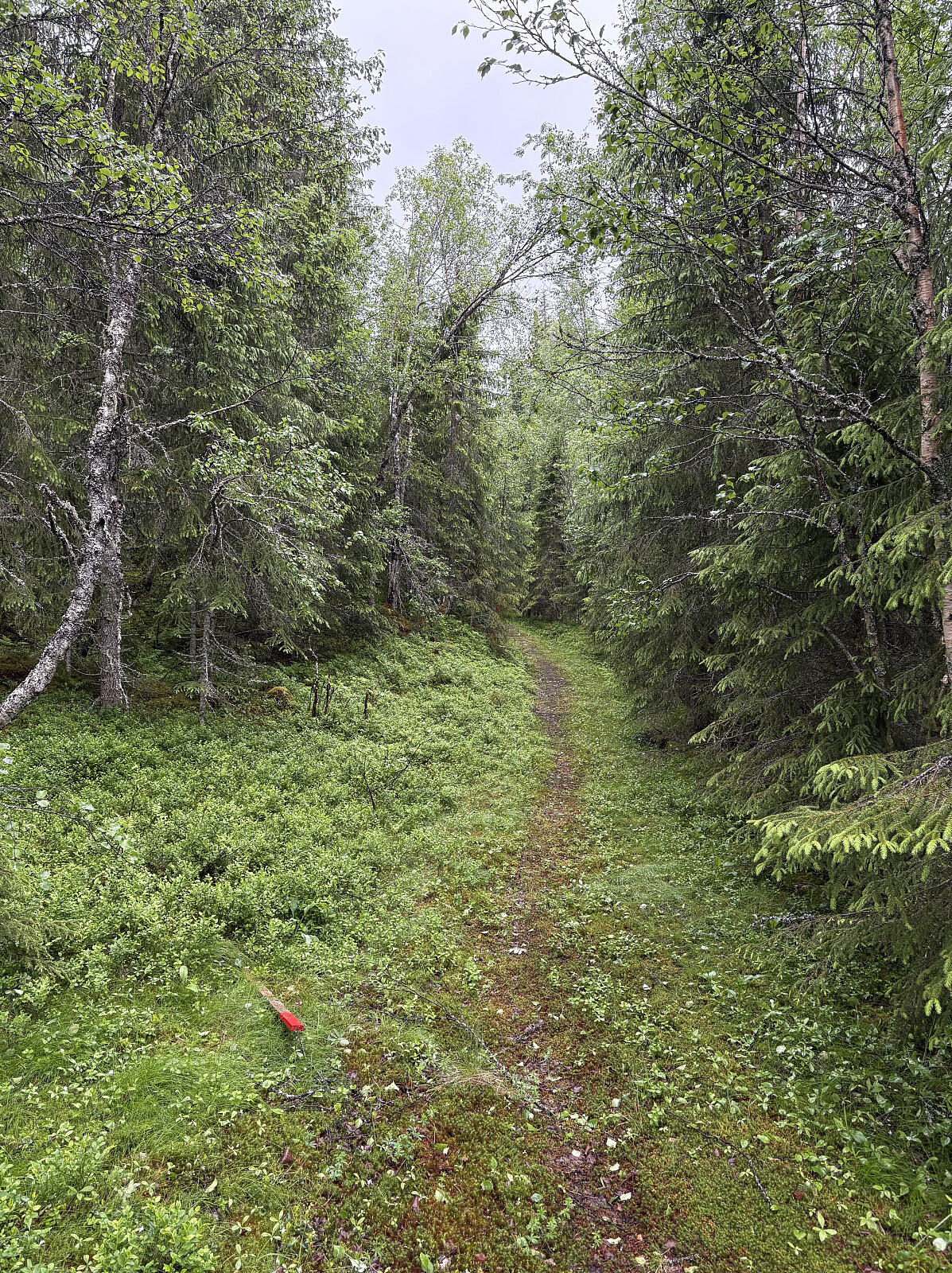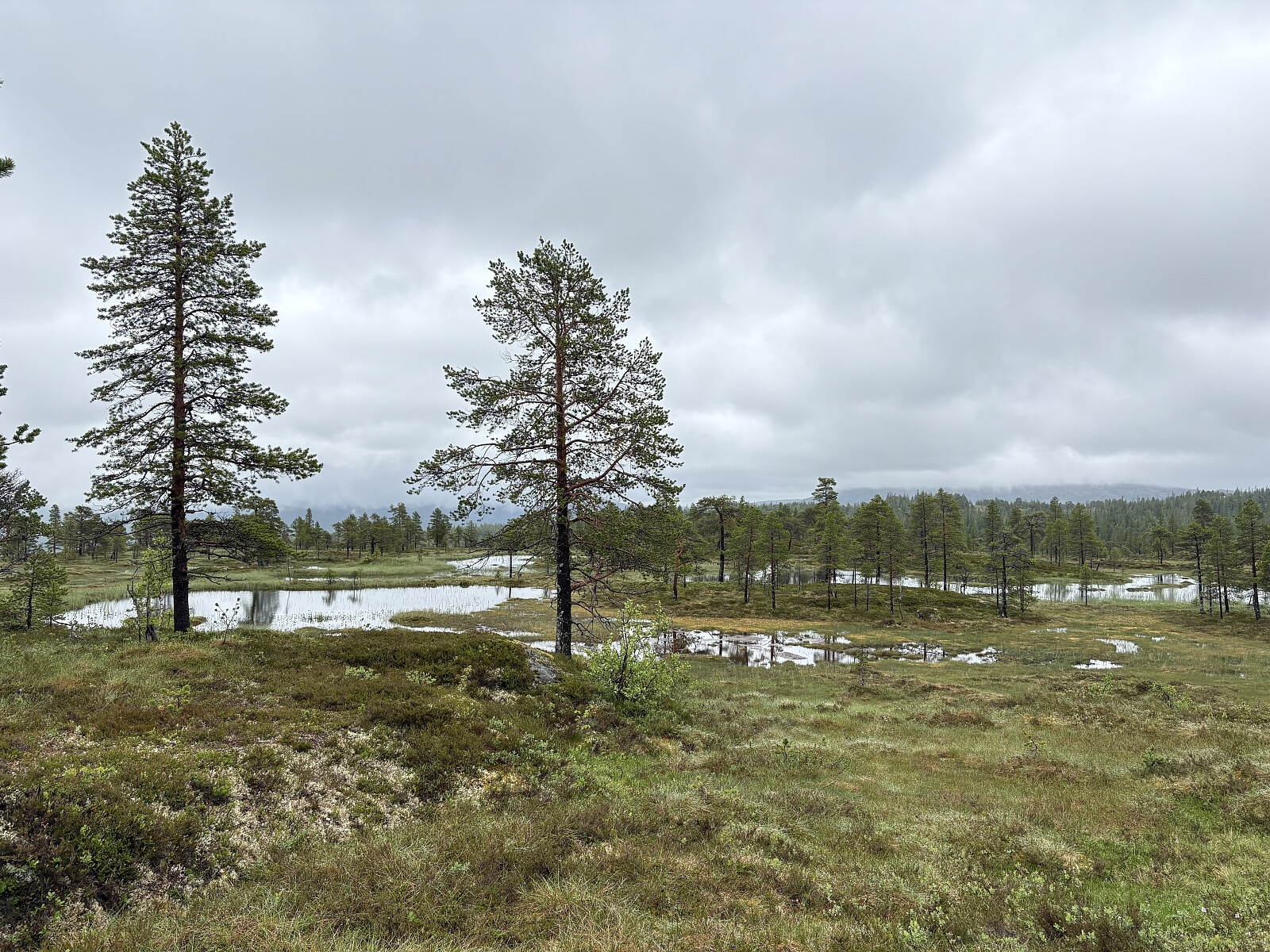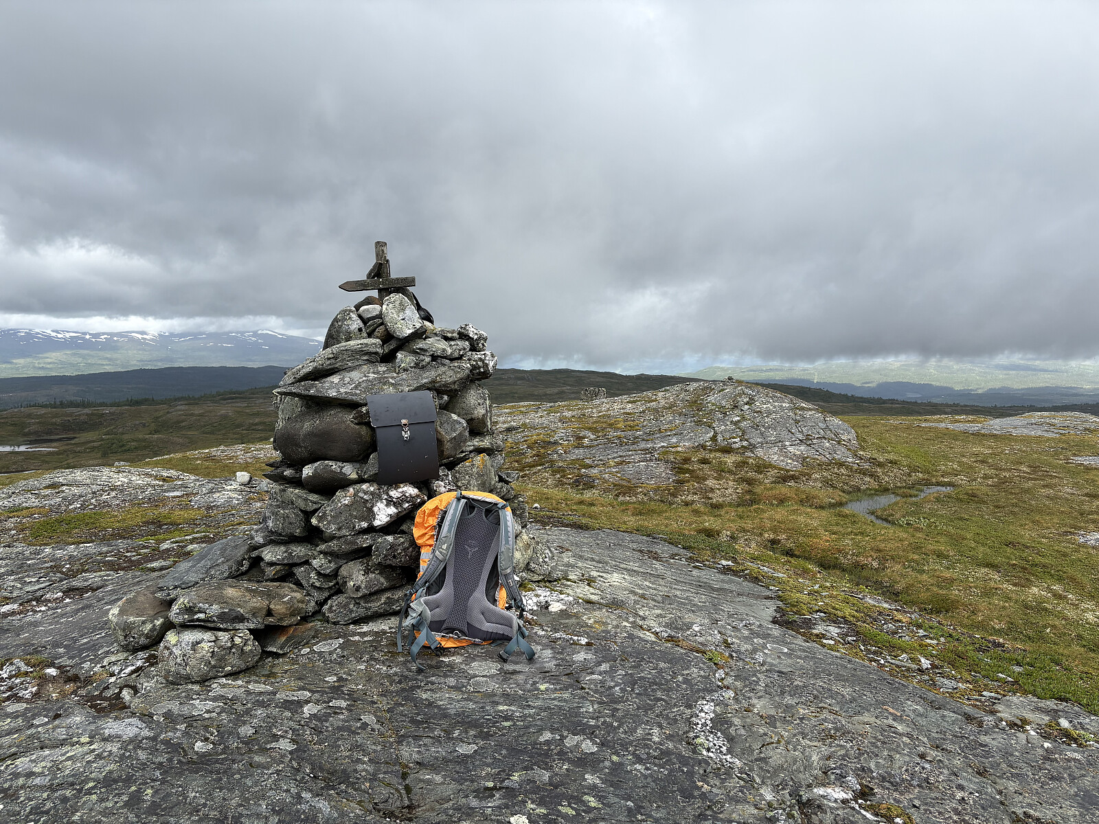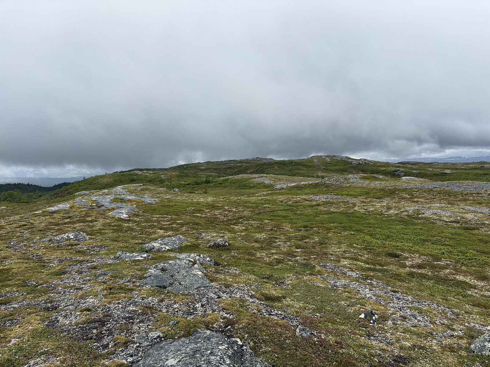 Jeg parkerte på en stor parkeringslomme langs hovedveien i Teveldalen like ved der hvor Fjelldalsbekken renner under veien. Herfra fulgte jeg merket sti innover mot Dalavola. Etter et kort stykke kom turens største utfordring, nemlig å krysse Fjelldalsbekken som var blitt ganske stor etter både snøsmelting og mye regnvær de siste dagene. Det gikk akkurat greit uten at jeg ble våt, og dermed var det bare å nyte turen videre på god sti og fint skogsterreng. I god trøndersk stil var det selvsagt en del myrområder underveis men ikke verre enn at det var mulig å unngå de våteste partiene. På Fjelldalshøgda var jeg kommet over tregrensa og kunne se over til Dalavola. Det blåste litt mer oppe i høyden men heldigvis var været i ferd med å lette litt etter en litt tåkete start. Vel fremme ved toppen var det såpass klart at alle toppene rundt kunne nytes mens jeg inntok lunchen. Samme rute tilbake igjen.