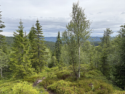 Jeg kjørte inn til skistadion og videre på bomvei (Norgesbom) opp til p-plassen for utgangspunktet til Ruketuten (til høyre i kryss rett etter bommen, deretter til venstre i neste veidele). Herfra på merket og god sti helt opp til toppen. Selve toppunktet ved antennemasta var ganske gjengrodd, men fra nabokollen var det flott utsikt mot nordvest. Samme vei tilbake.