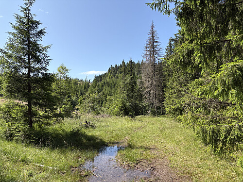 Etter besøket på Ruketuten kjørte jeg nesten helt ned til skistadion igjen og tok så til høyre like før bommen. Jeg fulgte Svartangveien inn til en p-lomme ved Holedalstua. Herfra på skogsvei et stykke oppover mot Oppsalfjellet, etter hvert på en sti som ble mindre og mindre synlig. Til slutt ble det ren bushing opp til toppen. Det var mulig å se over til høyde 534 SØ for toppen, ellers var det ikke noe utsikt å snakke om fra toppen. Toppunktet var markert med en liten steinvarde.