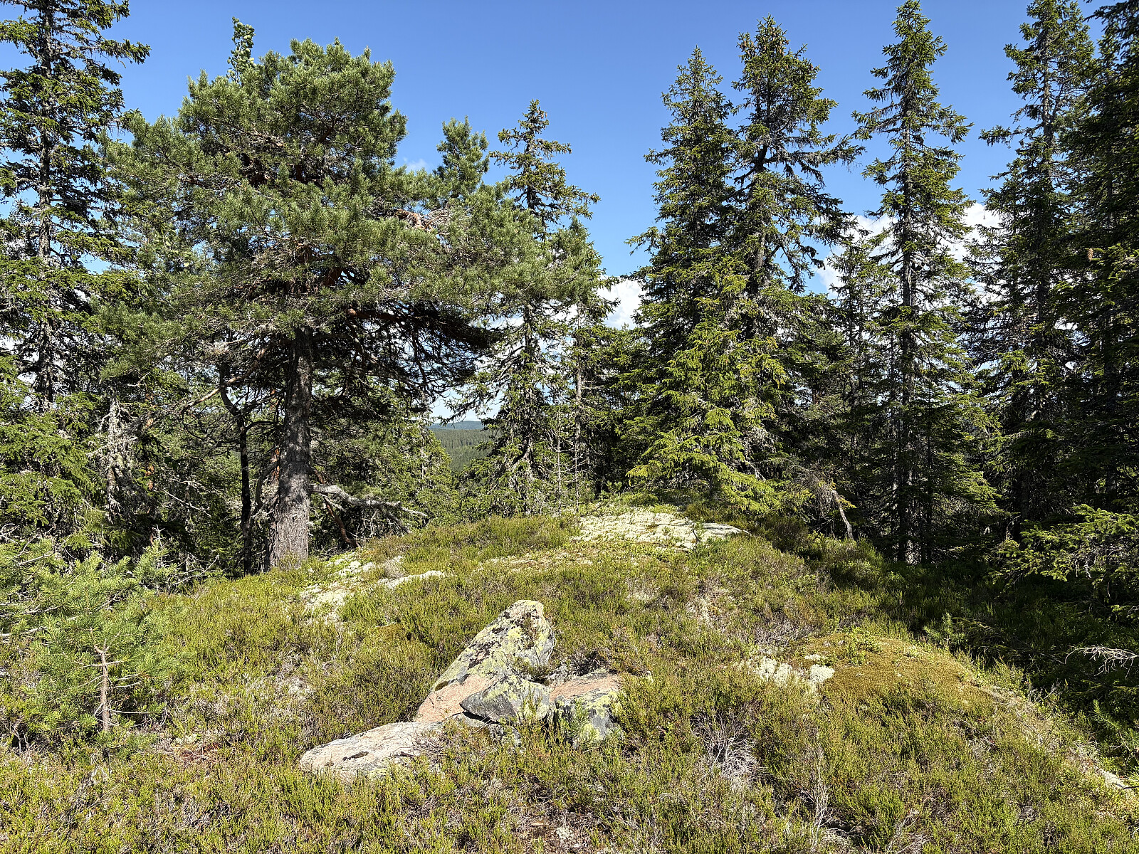 Videre bort til toppunktet var det fint skogsterreng å ferdes i, noe småkupert men fint å gå. Toppunktet var relativt åpent og markert med en liten varde, men heller ikke her var det noe utsikt å snakke om. Tilbaketuren gikk rett ned fra toppen, ganske tilsvarende ruta jeg valgte oppover.