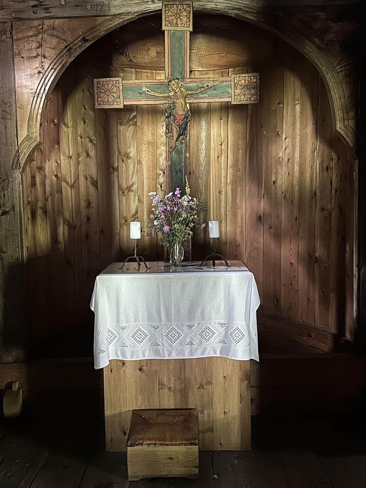 Inne i kirken står fire staver, tilsynelatende uten noen funksjon. Tegn tyder på at de har båret et tårn eller en takrytter, omtrent som stavkirken i Uvdal, men istedenfor en sentral midtmast har den hatt fire.