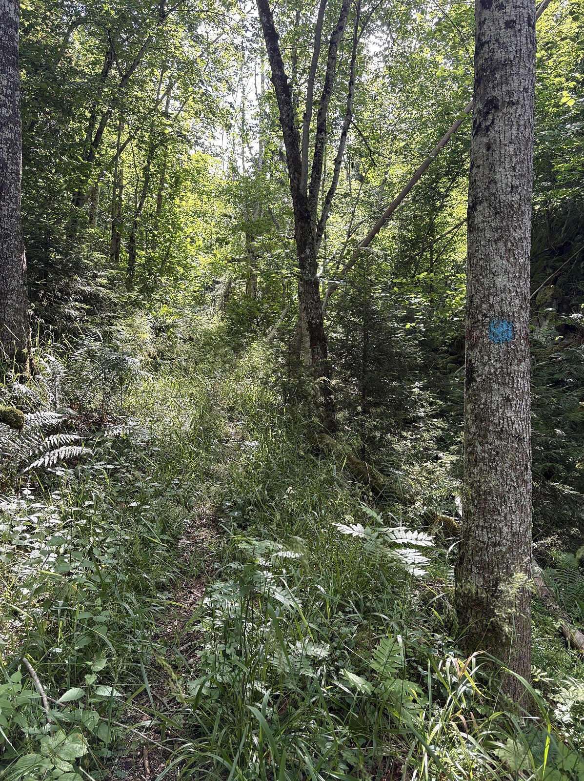 Neste mål på turen var Skilskjølen. Jeg syklet videre innover skogsveien frem til den merkede stien sør for Limetjønn. Også denne stien var stedvis temmelig gjengrodd og et par steder måtte jeg søke litt for å skjønne hvor den gikk. På nordsiden av Skauguttleiråsen førte stien ned i et dypt skar mellom Skilskjølen og Valldalsås. Siden den merkede stien går gjennom dette skaret trodde jeg at oppgangen til toppen var på nordsiden. Skaret var imidlertid nesten ufremkommelig på grunn av jungel, veltede trær, vann, myrer og bratte skrenter. Jeg klarte på et vis å komme meg gjennom og fikk klatret meg opp til Skilskjølen fra nordsiden, denne ruta kan ikke anbefales på noe måte! Selve toppen var relativt åpen men uten den store utsikten.
