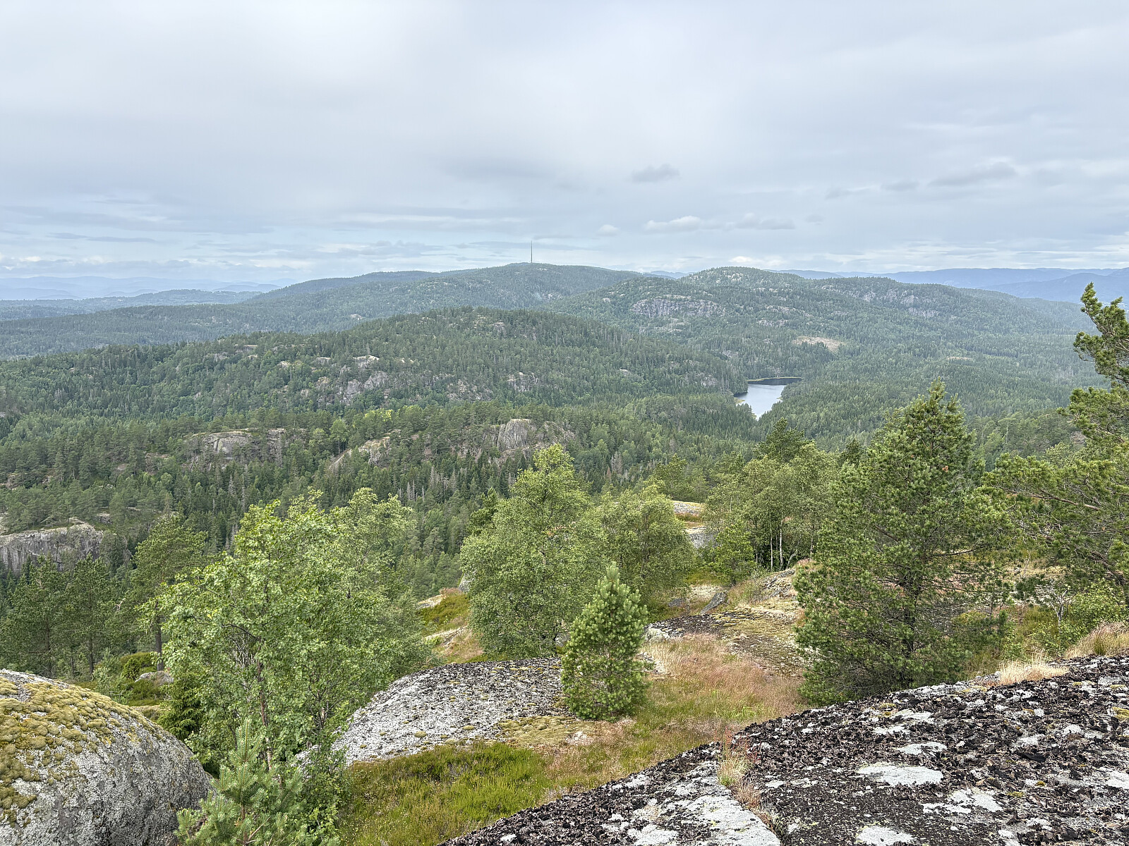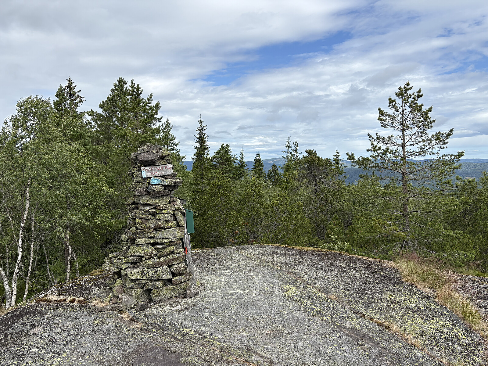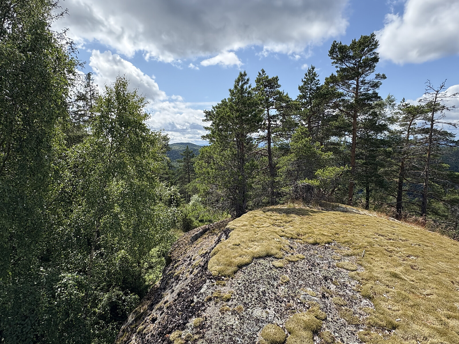 På vei tilbake mot sykkelen kom jeg ut av stien og oppdaget dette da jeg var 30 meter nedenfor toppen av Skauguttleiråsen. Jeg tok derfor turen oppom denne også før jeg fortsatte ned til sykkelen. Sykkelturen gikk unna med et akkompagnement av tordenskrall som stadig kom nærmere, og jeg fikk akkurat festet sykkelen til bilen da himmelen åpnet seg fullstendig:)