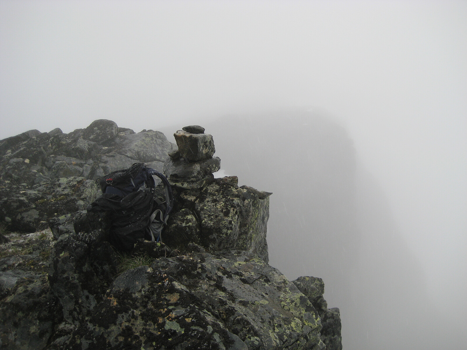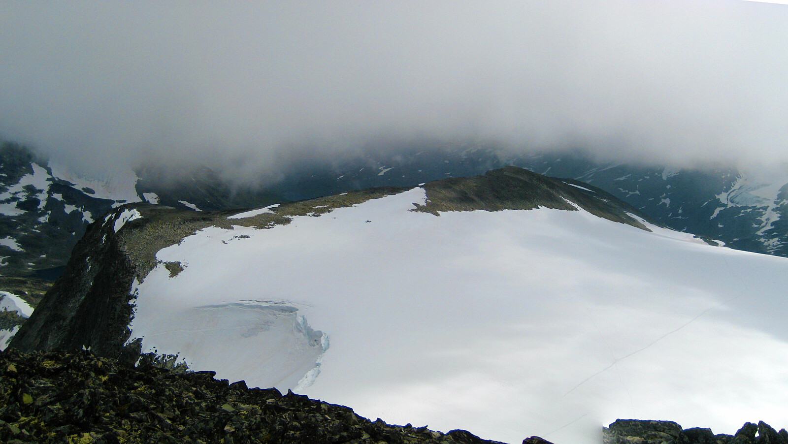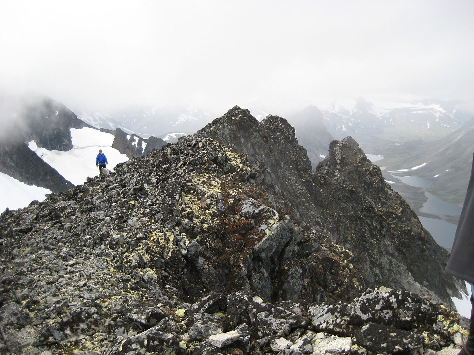 Retur omtrent samme vei vi hadde gått opp, nå i sludd regn og tåke. Tilbake på Leirvassbu kl 2030, kalde og våte, men godt fornøyd med å ha besteget en ny 2000-meter hovedtopp og to sekundærtopper!