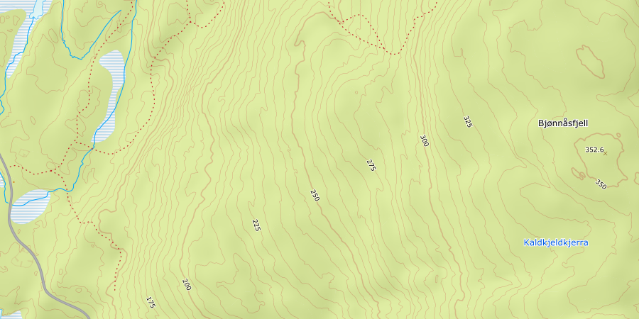 Jeg kjørte inn mot Haugland nord for Kroken kirke. Herfra fulgte jeg bomvei innover et godt stykke langs Storelva til jeg var rett vest for toppen. Det var en del tømmervirksomhet i området men jeg fant en plass like ved der stien opp mot toppen går fra. Stien var merket og grei å følge helt opp til toppen av Bjønnåsfjell. En varde markerer toppunktet på den relativt åpne og flate åsen. Ingen utsikt.