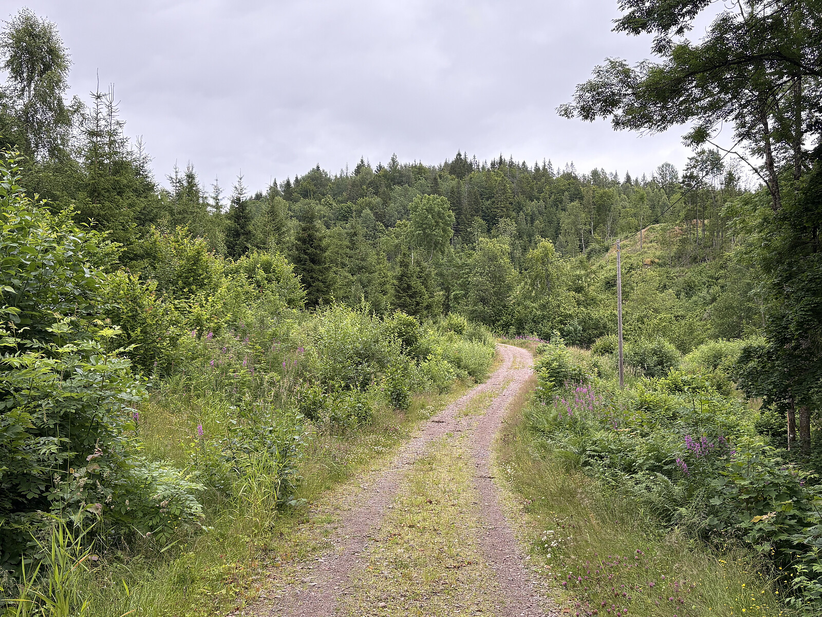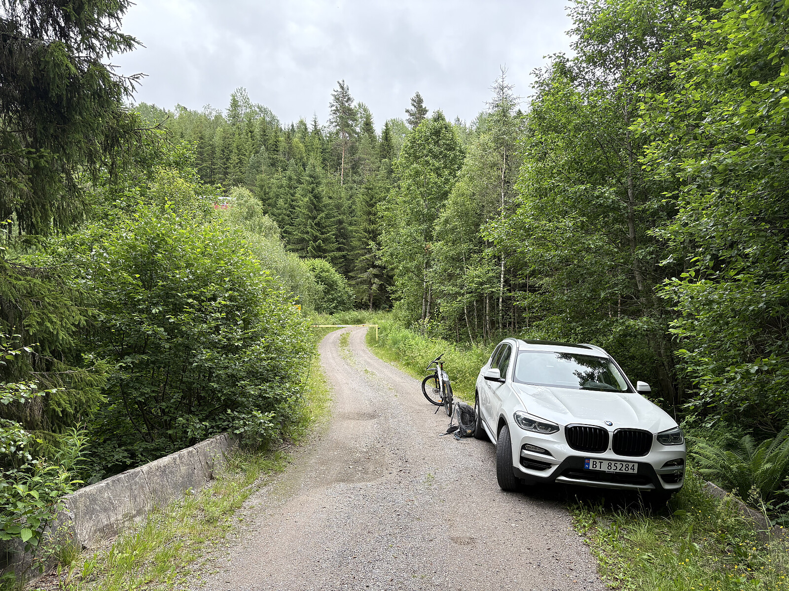 Jeg kjørte oppover Holtebygdveien til Nyheim. Her er det trangt og ikke så mange parkeringsmuligheter, men jeg fikk da på et vis satt fra meg bilen langs stikkveien like ved bommen.