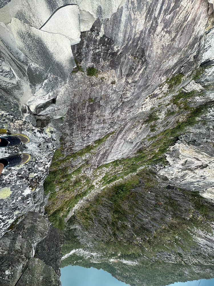 Veldig fint og lettgått terreng. Paradisjuvet var imponerende men det var overraskende seigt og langt ut hit. Lettgått og fin sti. En steinformasjon som står helt utpå kanten. Her kjente jeg faktisk at beina begynte å skjelve. Det var såpass. Kroppen ble liksom dratt ut mot juvet. Greit å bare gå pent tilbake. Stakk en tur ned til det lille tjernet ved demmingen for å sikre en turpost. Noen folk på tur, men overraskende stille.