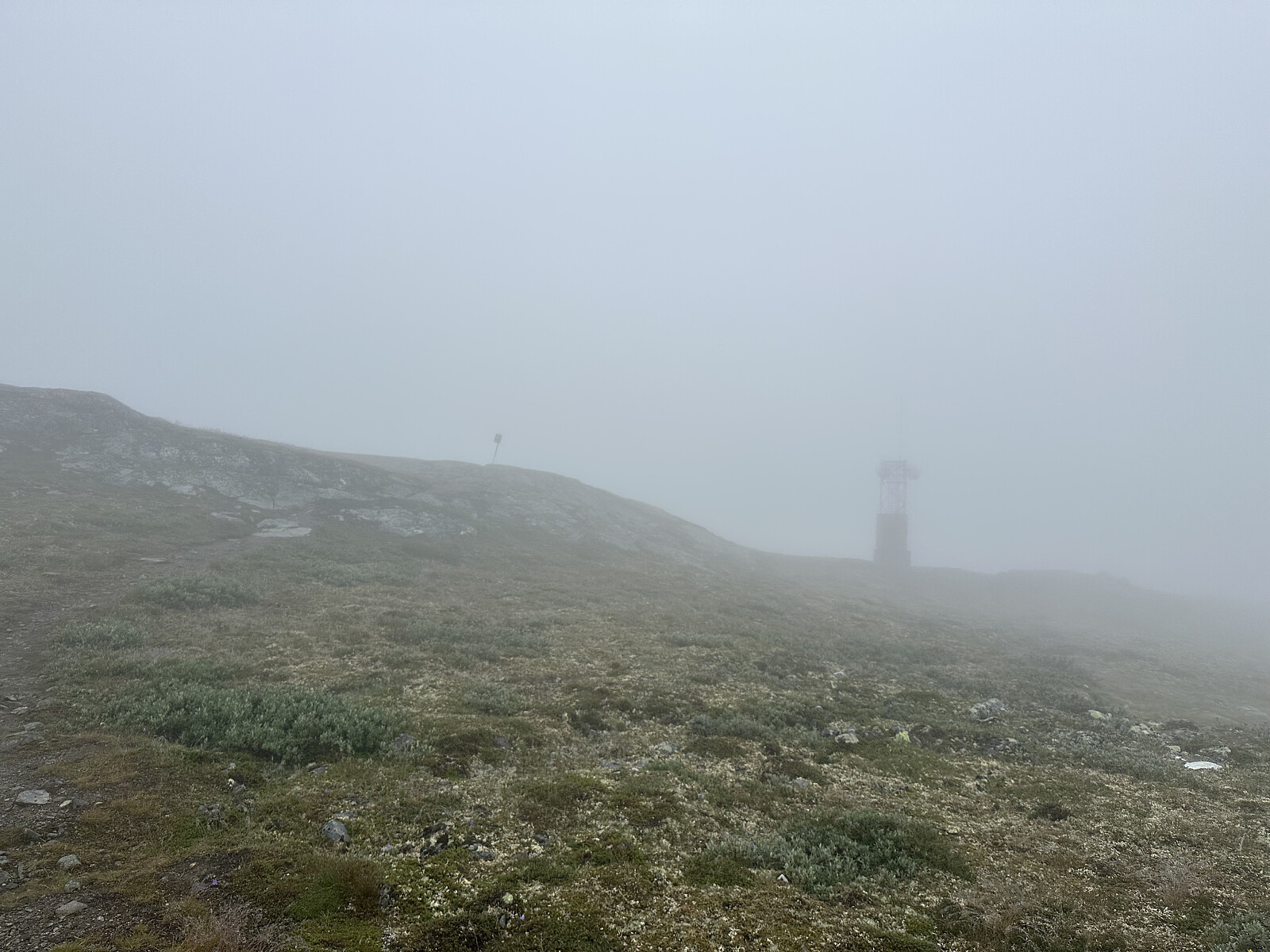 Eline skulle gå Fanaråken alene så det skulle hun få lov til. Jeg tok en rask tur her. Fint terreng. Berdalsnosi er skilta og merka på god sti. I mye bruk tydeligvis. Det var såpass tåka at det var nesten vanskelig å se den store masta ved toppen. Toppunktet er noe ved siden av selve masta.