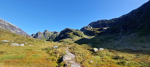 Ved Øvrekvanndalen gjekk grusvegen over i sti. Vi fulgte hoved stien mot Vendingen i ca. 5-600 meter før vi tok av på ein annan sti som gikk bratt oppover i retning Kvitebekkstjørna.