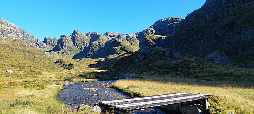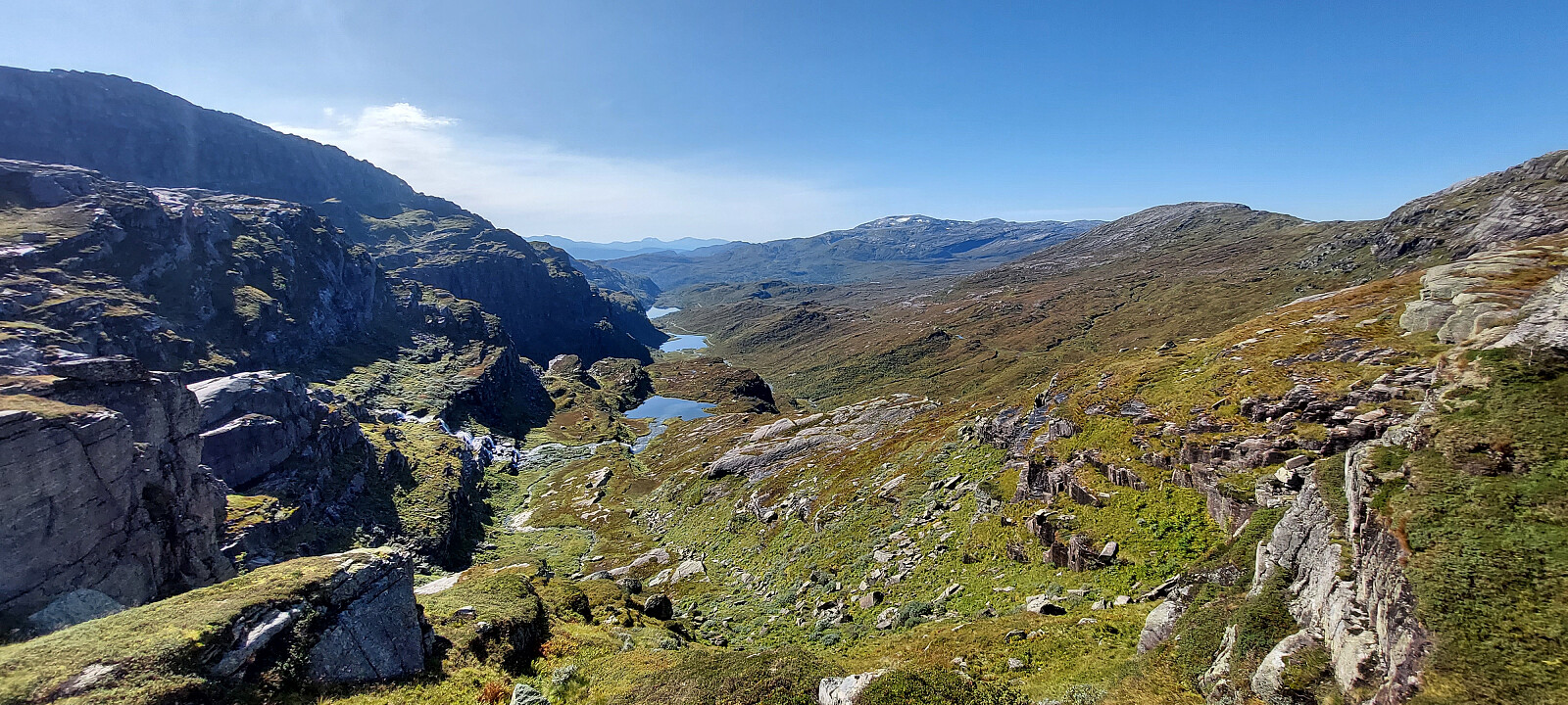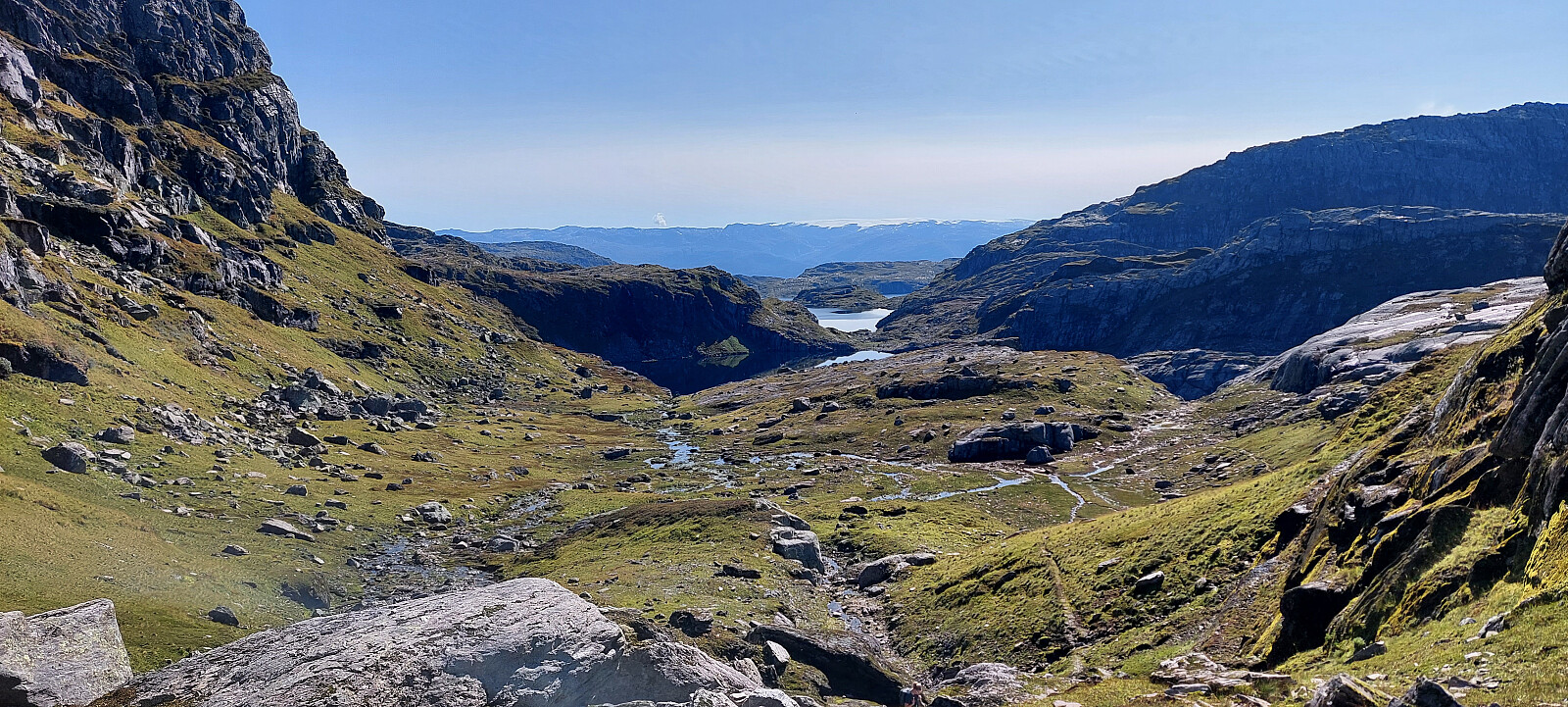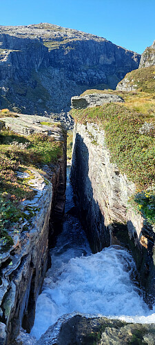 Vi kom først til eit mindre vatn der utløpet gjekk gjennom eit smalt juv som vi måtte hoppe over. Full konsentrasjon og god satts på Tonje i det ho hoppa over her. Det hadde vert ein klaustrofobisk opplevelse å dette ned i her,