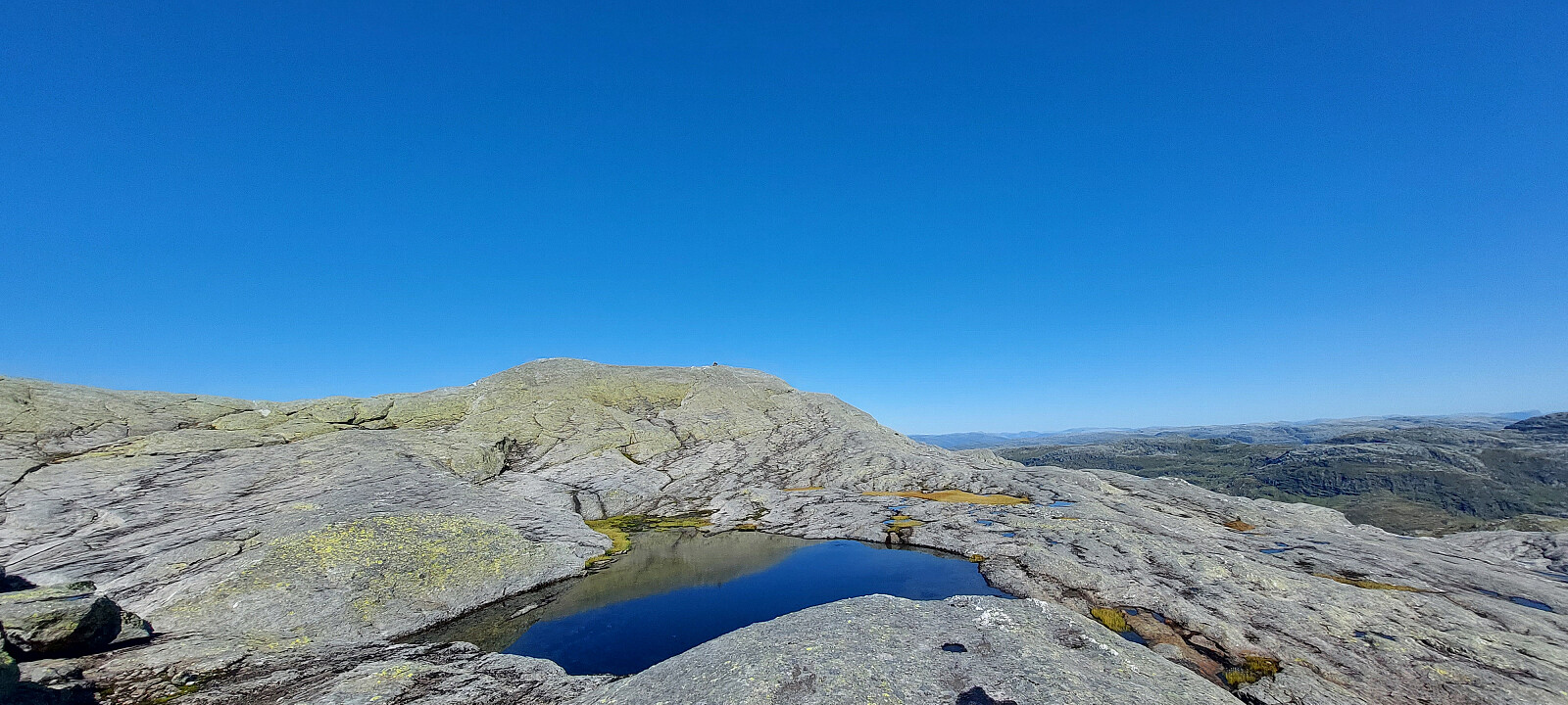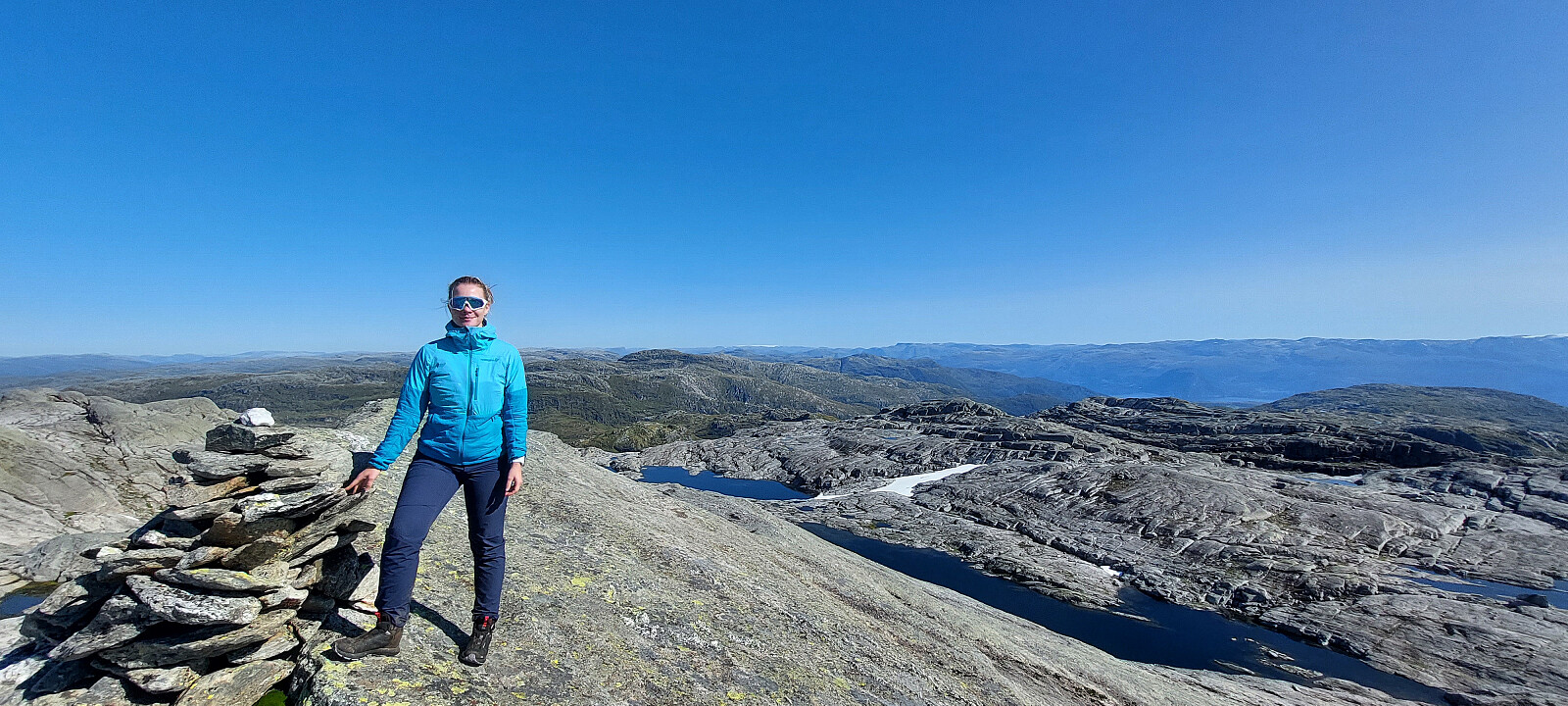 Frå toppen kunne vi nyte en virkelig flott dag med utsikt over store delar av Hordaland. Det blei ei god pause her med real turmat i solsteiken.