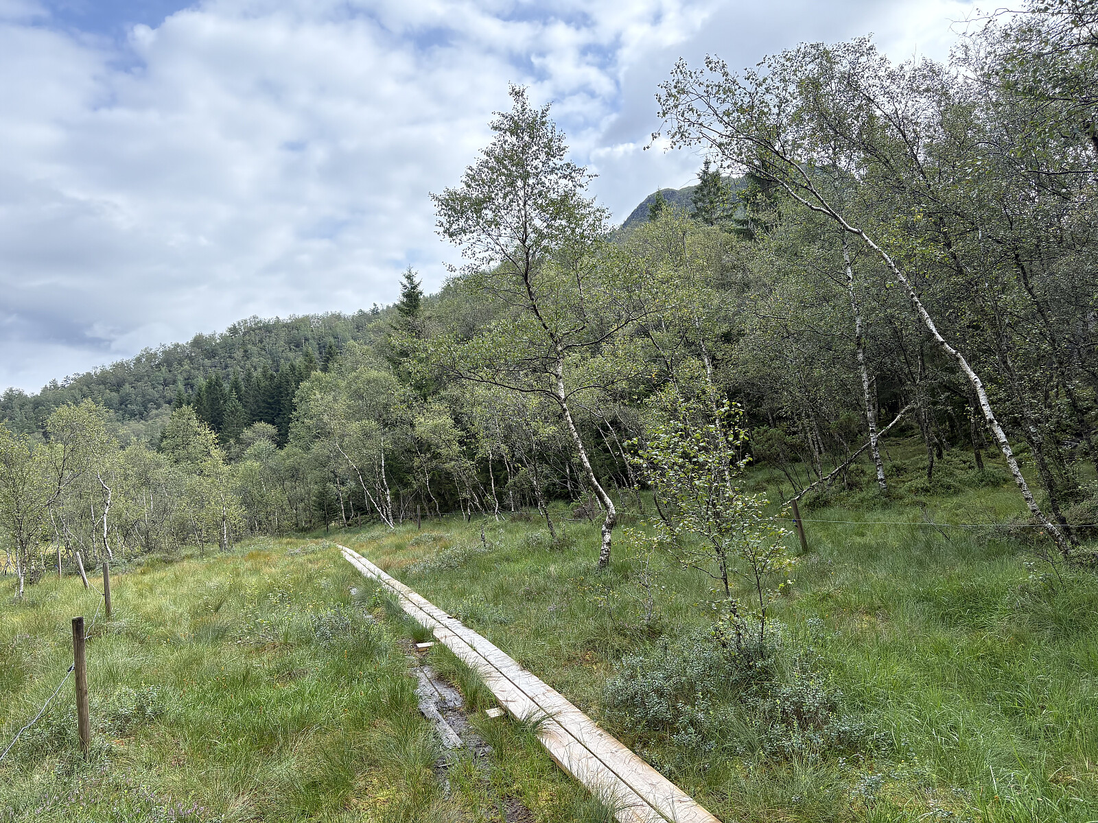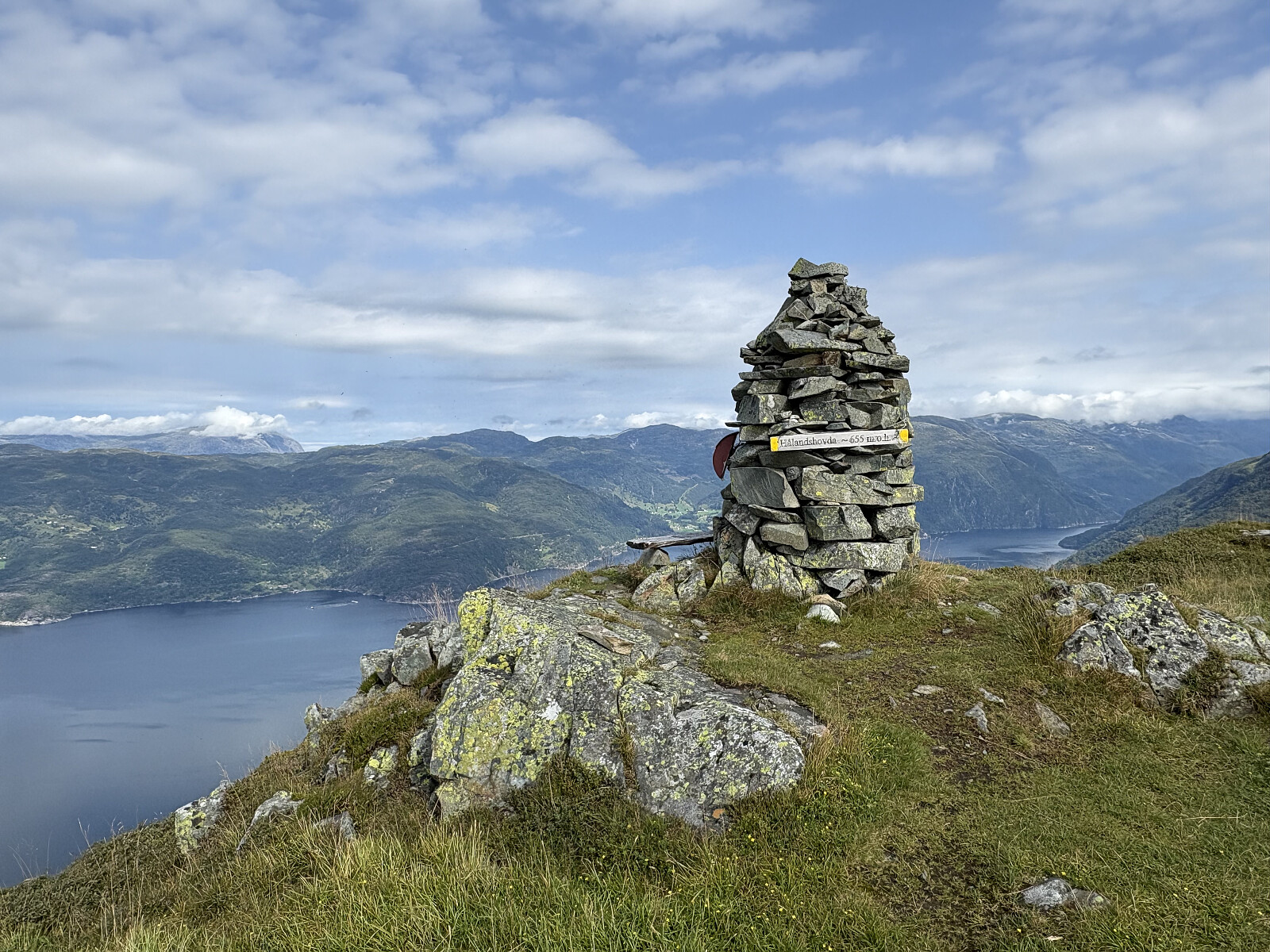 Tur nummer to denne dagen hadde samme utgangspunkt som turen opp til Håfjellet, så det ble bare en rask pitstop innom bilen før jeg var av gårde igjen. Det var et informasjonsskilt ved turstart på Hålandsheio p-plass og stien startet like ved skiltet. De første 500 meterne gikk stort sett flatt innover til man hadde passert et myrområde, deretter bar det i bratt stigning opp til toppen. Underveis passerte jeg en plass som var skiltet Hovdastølen, og like etterpå et utsiktspunkt.
