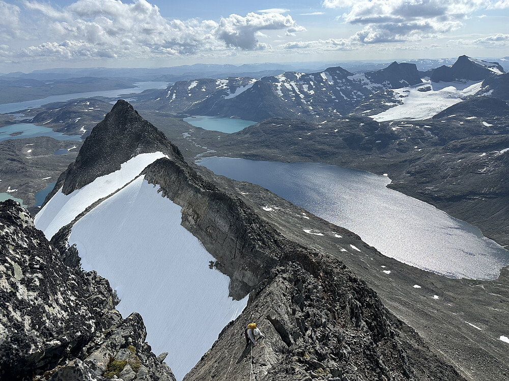 Eline klarte seg relativt bra selv om forberedelsene ikke var av de beste i år. Tæl, vilje og litt sukker så ordner det meste seg. Tid også da. Jeg er imponert. Ikke bare bare å presse seg såpass langt. Store gnagsår og. Klatringa gikk fint selv om hun kjente litt på eksponeringa. Også det at jeg ikke alltid var synlig var et element, kontra Austabotn hvor man alltid ser hverandre og kan kommunisere godt. Samma det - dette gikk godt over forventing. Kunne jo snudd på S2 og, men det var ikke tema. Havna bak et lag over traversen. Ble VELDIG mye venting, sikkert 1,5 time ekstra.