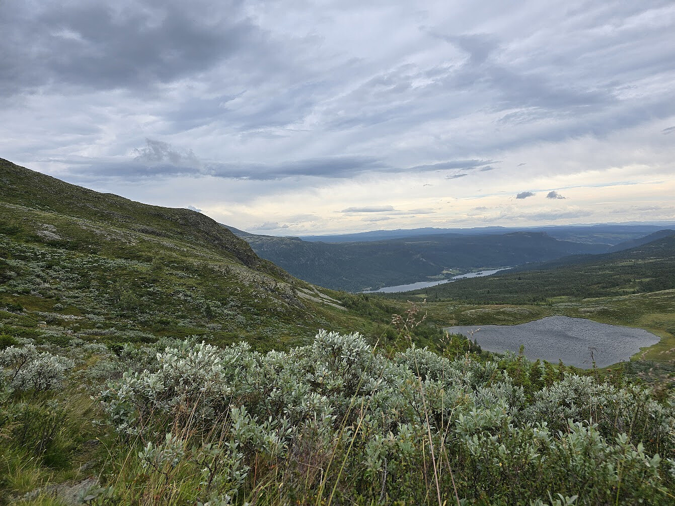 Sjekket GPS'en for alternativ rute ned - via Nedre Megrundstjønnet, og fant denne. Det var en ganske fin rute - veldig bratt - men da med utsikt i mye av tiden. Både inn mot Heidalsmuen og over Espedalsvatnet mot Øvre Svatsum. Litt hardt for knær med så tung sekk nedover, men det gikk helt fint. Men eneste jeg hadde "brukt" av de 25 kg i sekken var to polarbrød, noen striper med tubeost og to salamiskiver - så sekken var vel fortsatt like tung...