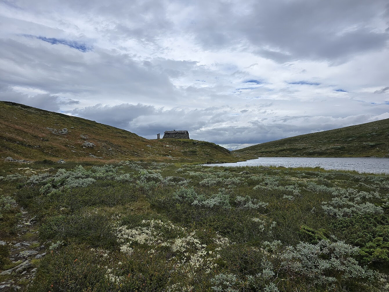 Men jeg tenkte at det kanskje var mulig å finne noe le og at det heller ikke ville være så ille. Så jeg fikk lånt meg bomnøkkel på Helvete og kjørte opp til Norgårdsetra. Derfra gikk jeg via Stylskar. Medbragt en tung sekk på 25 kg pakket med klær, mat, propanutstyr og godt med fiskeutstyr. Oppe ved Ulsteinbu banket jeg på og snakket med tre karer som satt og varmet seg. De hadde planlagt oter på Nedre Megrundstjønnet, men hadde gitt opp på grunn av vinden. Jeg gikk videre og opp på høyden så jeg jo at det var store skumtopper på vannet, og det var skuffende. Men jeg tenkte så at jeg kunne overnatte i Megrundsbua, så slapp jeg å dra opp teltet i denne sterke vinden.