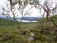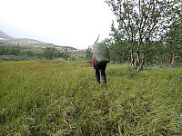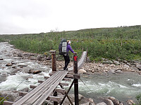 På grunn av ekstremt mye nedbør de siste dagene, så måtte vi gjøre om på de opprinnelige turplanene i fjellene i svartisenområdet. Vi bestemte oss da for å gå fra Randalen til Mo i Rana. Siden broa over Randalselva ved E6 ved Bolna er ødelagt for tiden, og resten av turfølget ikke hadde lyst til å gå langt på grusvei, så fikk vi Kjell til å kjøre oss innover grusveien i Randalen. Vi kjørte først helt til demningen, men her var det ikke mulig å krysse, kjørte så litt tilbake til skilt mot Randalskota og gikk nedover mot elva her for å finne broa over elva. Fant ingen sti før helt på slutten da vi nærmet oss broa, så ble litt bushing nedover, det gikk greit, men anbefaler å heller følge den rødmerkede stien som nok starter nærmere E6en enn der vi gikk ned.